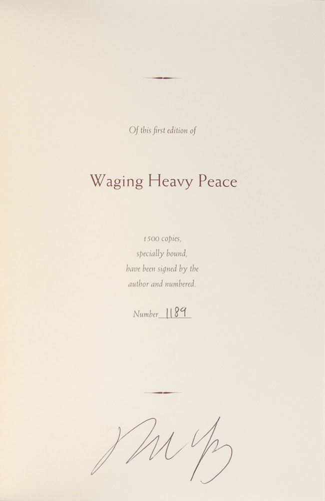Signed book: Waging Heavy Peace. First edition, limited issue, numbered 1189/1500. NY: Blue Rider Press, 2012. Hardcover with slipcase, 6.25 x 9.25, 502 pages. Signed on the colophon in black ballpoint. In very fine condition.