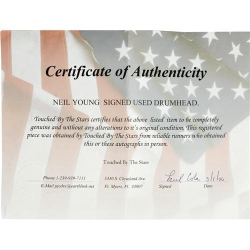 <B>Neil Young Signed Drumhead.</B></I> An 8.5" transparent drum head, signed by Young in purple marker. In Fine to Very Fine condition with mild to moderate wear and tear to the drumhead, none of which affects the signature. <I>Accompanied by a certificate of authenticity.</B></I><BR><BR><b>Shipping:</b> Clothing, Costumes & Jerseys (<a target="_blank" href="http://www.heritageauctions.com/common/shipping.php">view shipping information</a>) <BR><BR><B>Important notice
