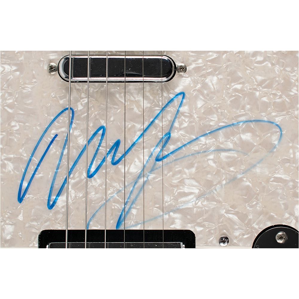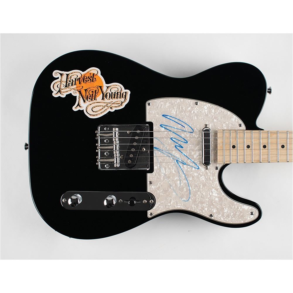 Black-bodied Glarry Telecaster-style electric guitar with an affixed 'Harvest, Neil Young' sticker, signed on the pearloid pickguard in blue felt tip. In fine condition.