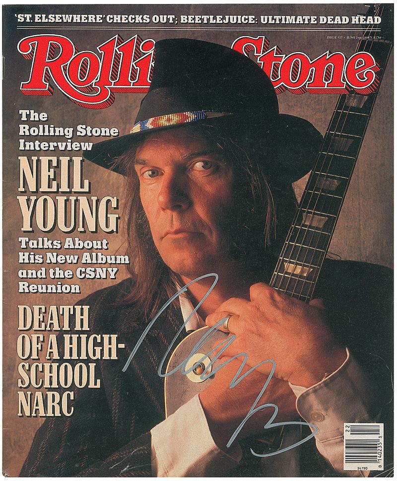 Rolling Stone magazine, dated June 2, 1998, featuring Young on the cover, signed on the front cover in silver ink. In fine condition.