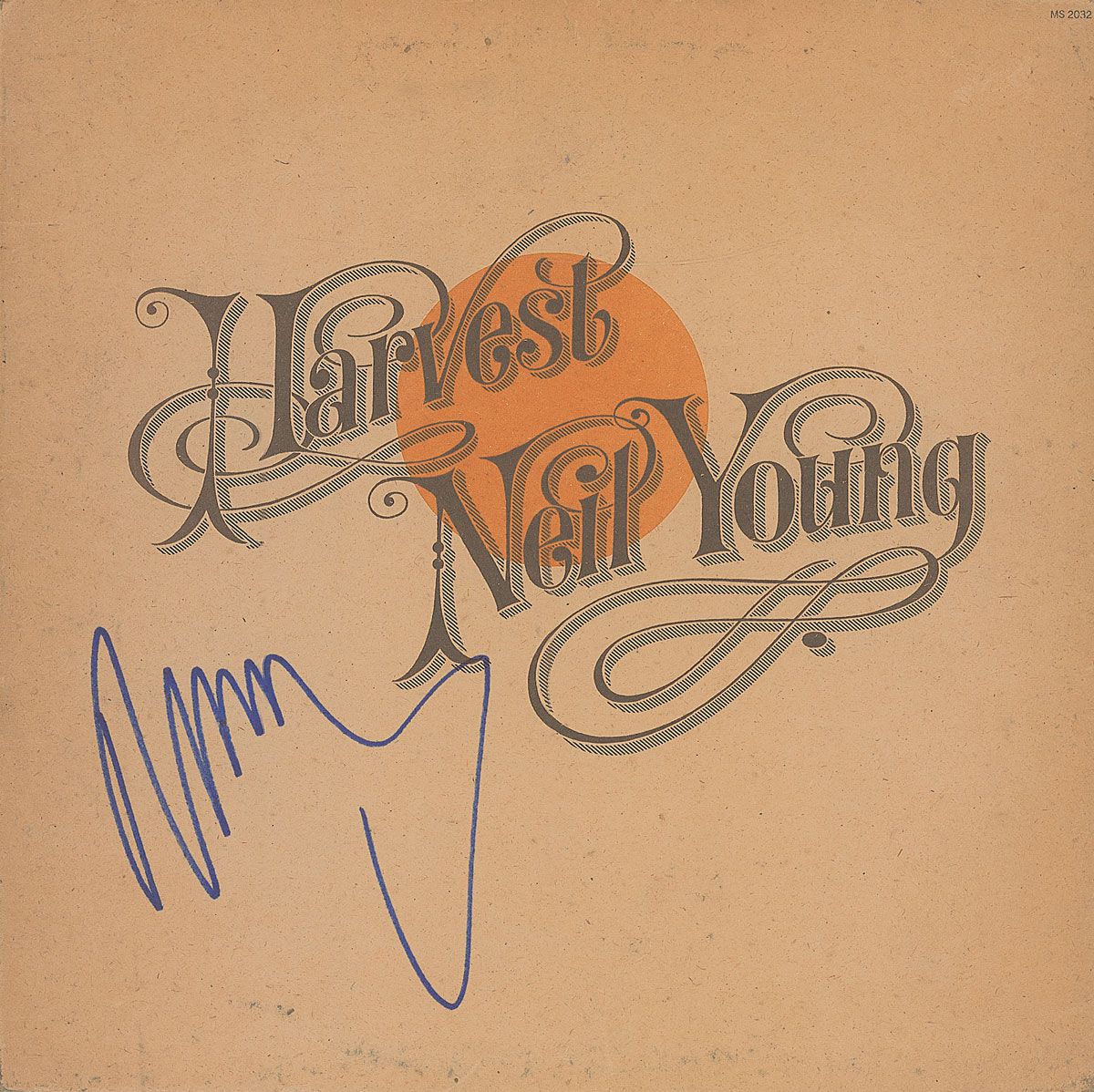 Harvest album signed in-person on the front cover in blue felt tip. Light overall toning and complete separation to top and bottom edges, otherwise fine condition. The record is not included. Originally obtained by in-person specialist Mike Wehrmann.