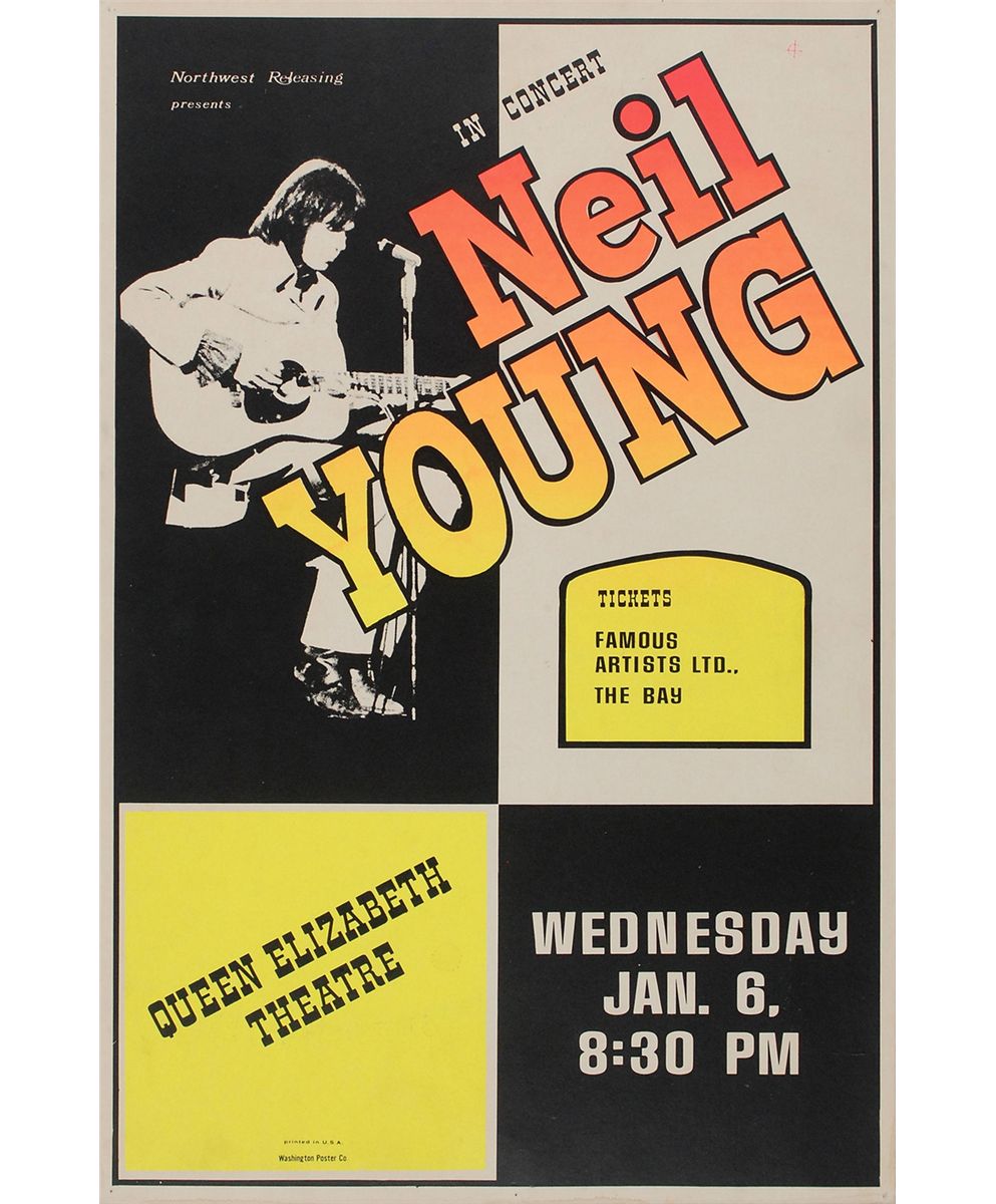 Window card poster for a Neil Young show at the Queen Elizabeth Theatre, January 6, 1971, 15 x 22.5, featuring a hi-contrast image of Young and neon lettering. In fine condition, with tiny tack holes to corners.