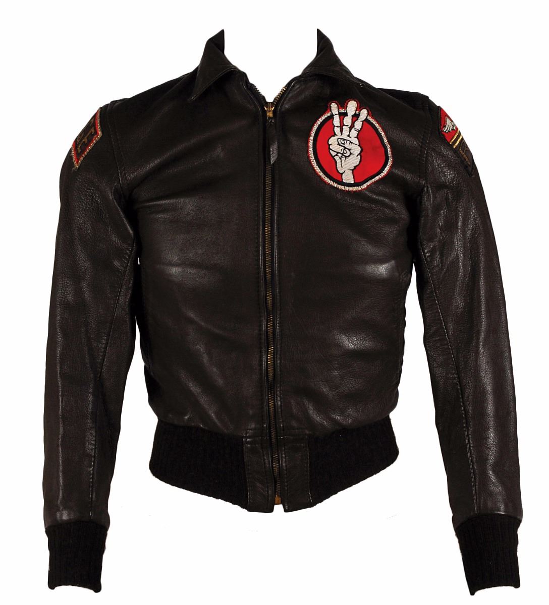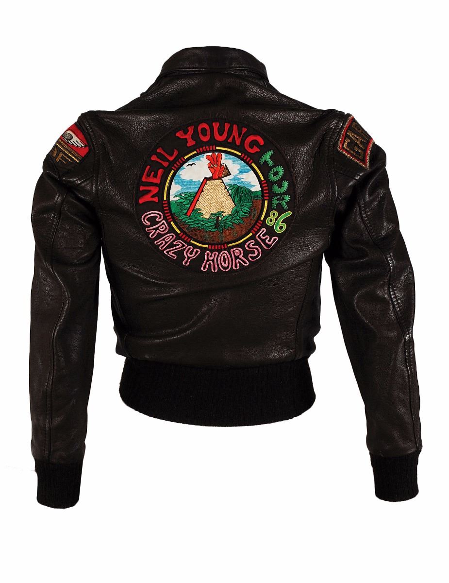 Scarce, high-quality dark brown leather jacket from Neil Young & Crazy Horse's 1986 tour, made by Langlitz Leather, featuring patches on the left breast, both sleeves, and back. In fine condition. Accompanied by a letter of provenance from the original recipient, who notes that she traveled with the tour and received the jacket from its designer, James Mazzeo.