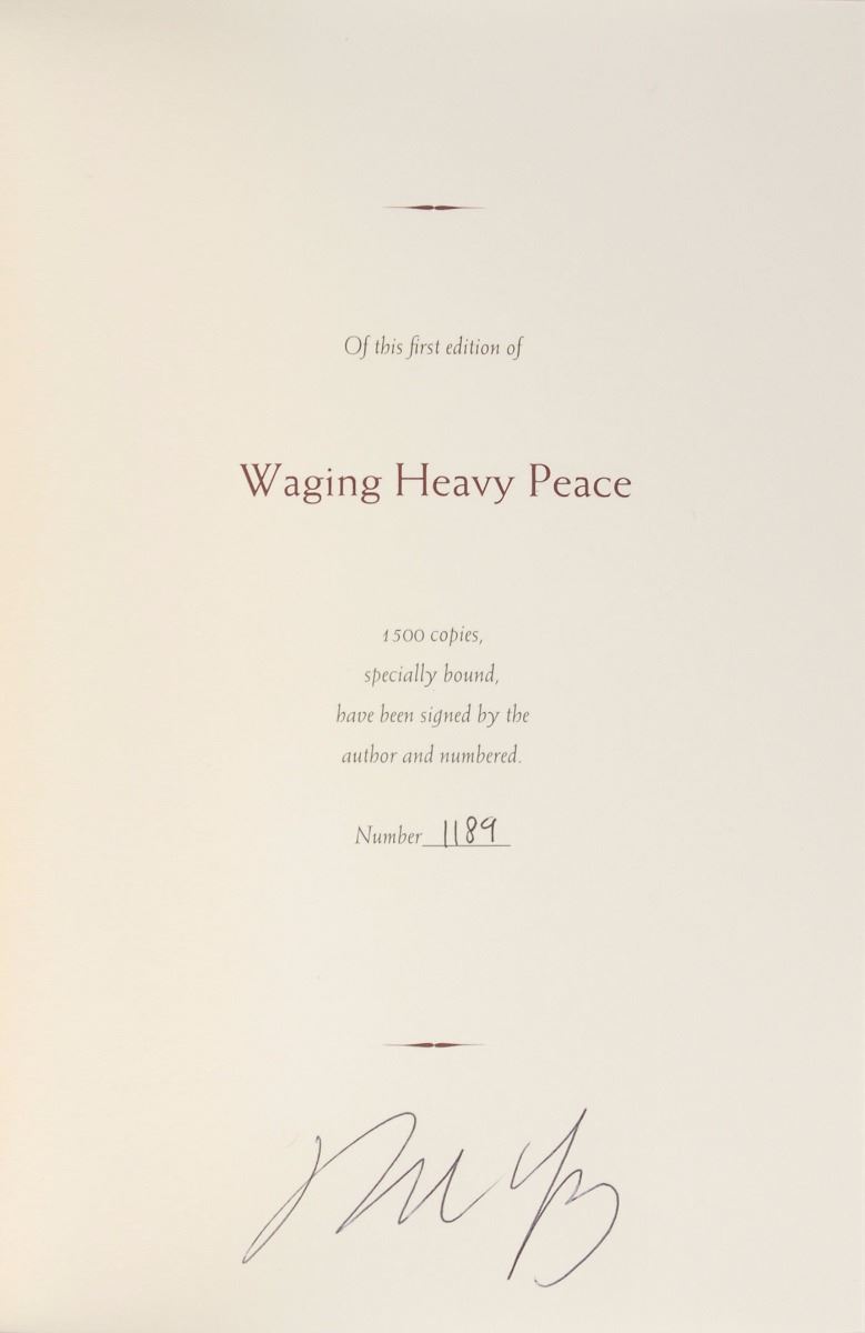 Signed book: Waging Heavy Peace. First edition, limited issue, numbered 1189/1500. NY: Blue Rider Press, 2012. Hardcover with slipcase, 6.25 x 9.25, 502 pages. Signed on the colophon in black ballpoint. In very fine condition. Pre-certified REAL.