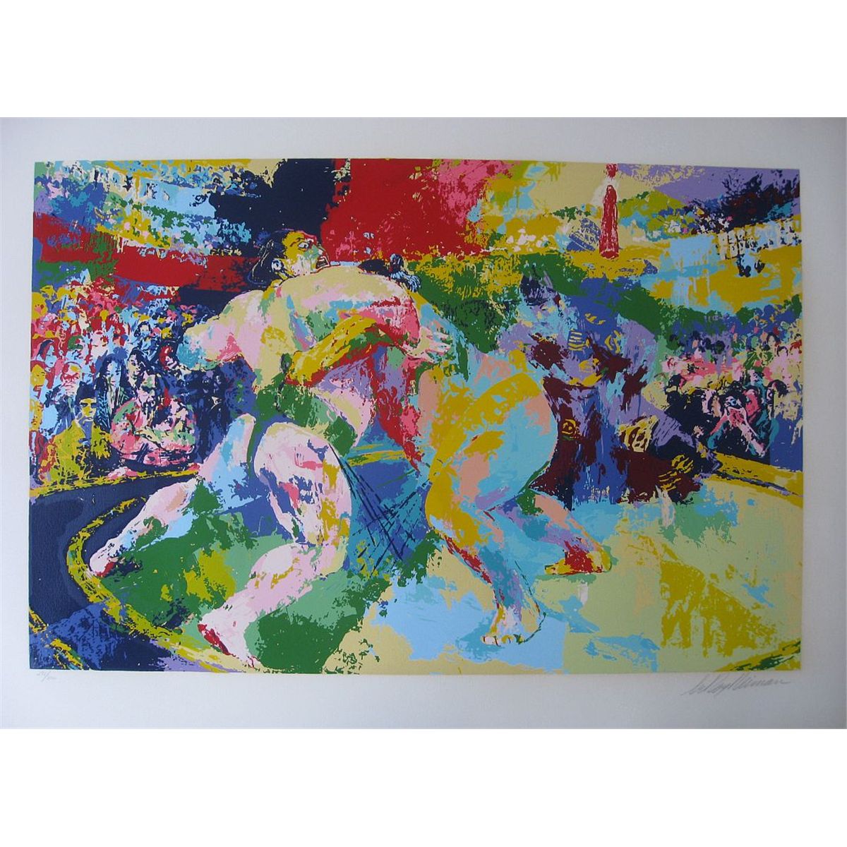 Best known for his brilliantly colored, stunningly energetic images of sporting events and leisure activities, LeRoy Neiman is probably the most popular living artist in the United States. The artistic style of the fabulously successful Neiman is familiar to a remarkably broad spectrum of Americans --"rich and poor, black and white, urban and rural, educated and illiterate," and young and old alike. He was the official artist at five Olympiads. Millions of people have watched him at work: on ABC TV coverage of the Olympics,as CBS Superbowl computer artist, and at other major competitions, televised on location with his sketchbook and drawing materials, producing split-second records and highly developed images of what he is witnessing. "Before the camera, such reportage of history and the passing scene was one of the most important functions of painters and draftsmen of all sorts. Mr. Neiman has revived an almost lost and time-honored art form," Carl J. Weinhardt observed in the catalog for the exhibition of Neiman's 1972 Olympics sketches, which was mounted that year by the Indianapolis Museum of Art. In the Christian Science Monitor (May 2, 1972), Nick Seitz wrote that Neiman, who has been labeled an American Impressionist, "has the journalistic talent, as well as the artistic ability, to convey the essence of a game or contestant with great impact, from the Kentucky Derby to Wilt Chamberlain, from the America's Cup to Muhammad Ali, from the Super Bowl to Bobby Hull."