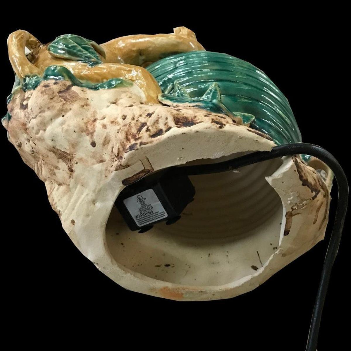 Rare, Circa 2000, artist originallimited edition ceramic figural table fountain, featuring a large monkey chimpanzee holding a shell, flanked by smaller monkeys. Water pours from the shell & recirculates from base. Appeared in the Neiman Marcus catalog circa 2000. Two piece set with fountain & ceramic base dish with working motor. * flaw on one of the smaller figure's arms, created during the firing process of production. 15" D X 15" H.