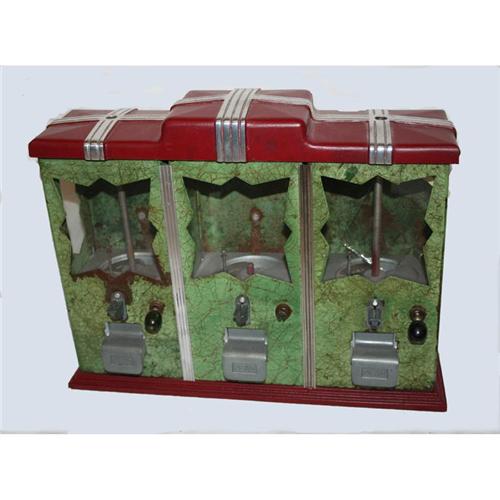 Neko - Triple Vendor - Iron and metal construction. Green and red with silver accents in Deco styling. Neko in raised letters on all three flaps. Heavy wear to left vendor around coin chute. Moderate wear in other areas.
