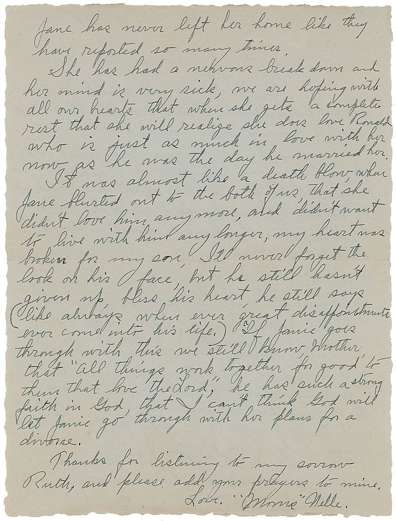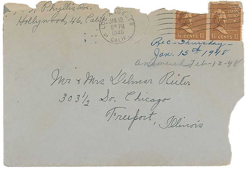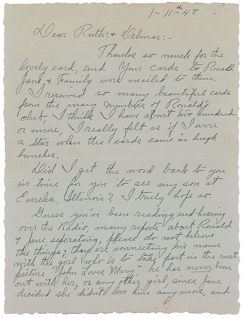 ALS signed “‘Moma’ Nelle,” one page both sides, 5.5 x 7.5, January 11, 1948. Letter to a fan of Ronald Reagan. In part: “Guess you’ve been reading and hearing over the radio many reports about Ronald & Jane separating, please do not believe the things; they are not connecting his name with the girl who is to take part in the next picture ‘John Loves Mary,’ he has never been out with her, or any other girl since Jane decided she didn’t love him any more, and Jane has never left her home like they have reported so many times. She has had a nervous break down and her mind is very sick, we are hoping with all our hearts that when she gets a complete rest that she will realize she does love Ronald who is just as much in love with her now as he was the day he married her. It was almost like a death blow when Jane blurted out to the both of us that she didn’t love him anymore.” In fine condition. Accompanied by the original mailing envelope. Reagan starred opposite Patricia Neal in the 1949 film John Loves Mary, Neal’s first film. The death of their premature daughter started the downspin of their marriage, though Wyman insisted their breakup was due to political differences. Despite Nelle’s best hopes, Wyman filed for divorce later in 1948 which was finalized the following year. This split also took a unique historical perspective, as Reagan was the only US President to be divorced; and Wyman the only ex-wife of a president. A deeply personal letter as she pours her heart out to relative strangers.