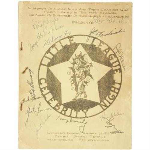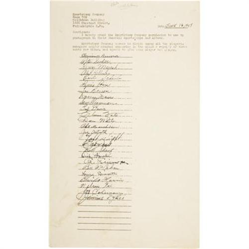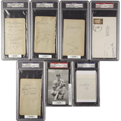 <B>Nellie Fox Memorabilia Archive with Multiple Autographs, Photographs & Uniform Pieces.</B></I> The first ever American League MVP to wear a White Sox uniform, this spunky little Hall of Fame second baseman is best remembered for his dependable glove work and the ever-present wad of tobacco between his cheek and gum. One fan's lifelong collection of Fox artifacts are compiled into this single lot for the collector and dealer alike. Presented are: 1) Circa 1959 salesman's sample Nellie Fox uniform jersey and pants. Tagged "Wilson 36" and "Wilson 32" respectively. White pinstriped flannel exhibits minor age toning but no other flaws of note. 2) Game worn sleeveless undershirt. Number "2" in marker on "Wilson [size] medium" tag, "Fox" written on equipment tape applied above rear hem. Good wear. 3) Seven autographs from Fox encapsulated in PSA/DNA holders. Four in ink, three in pencil. All NRMT or better. 4) 1953 "Little League Celebrity Night" program signed on cover by Fox, Chief Bender and others. Autographs are 9/10 or better, program VG. 5) 1949 Philadelphia Athletics team signed sheet signifying permission for use of images by Sportstamp Company. Autographs include Fox, Al Simmons, Jimmie Dykes. Autographs 9/10 or better, sheet is EX. 6) 1944 Jamestown Falcons team signed index card with Fox (minor league, age seventeen), NRMT. 7) Eight wire photos picturing Fox, dating from 1951 to 1959. Average size 7x9", EX+. <I>LOA from PSA/DNA (autographs). LOA from James Spence Authentication (autographs).</B></I><BR><BR><b>Shipping:</b> Miscellaneous Collectibles, Larg (<a target="_blank" href="http://www.heritageauctions.com/common/shipping.php">view shipping information</a>)