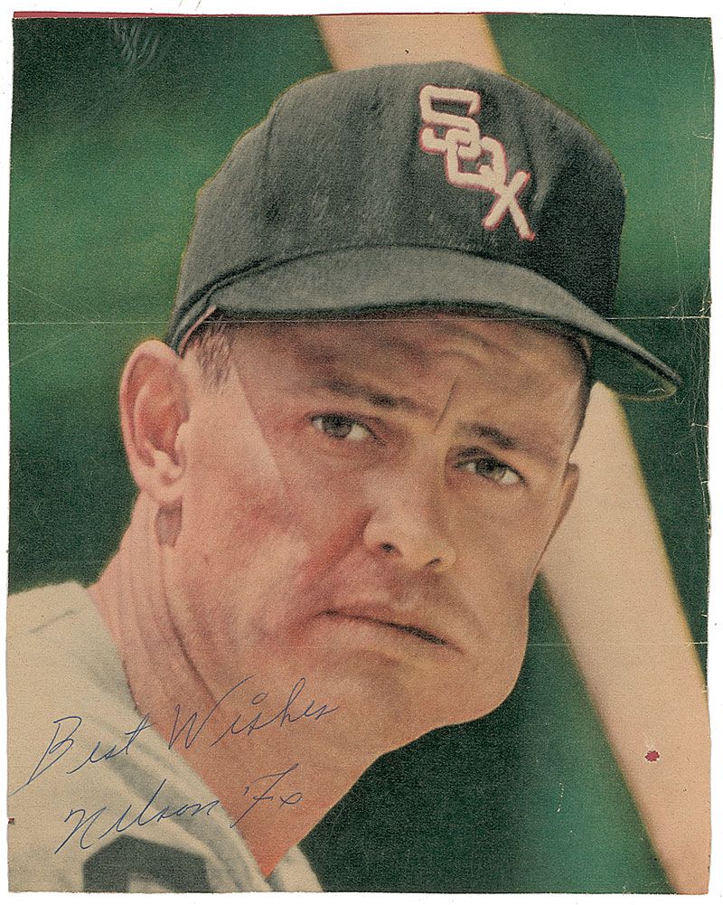 Vintage color 8 x 10 magazine photo of Fox, signed in blue ballpoint, “Best wishes, Nelson Fox.” Affixed to a same-size sheet. In very good to fine condition, with two horizontal mailing folds, scattered creases and slight rippling from adhesive to revers