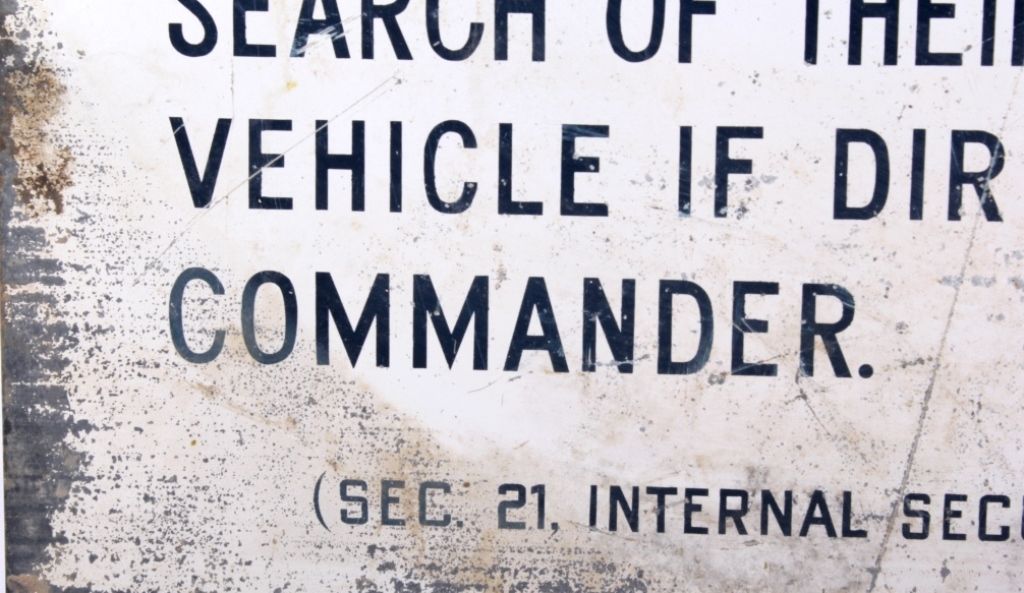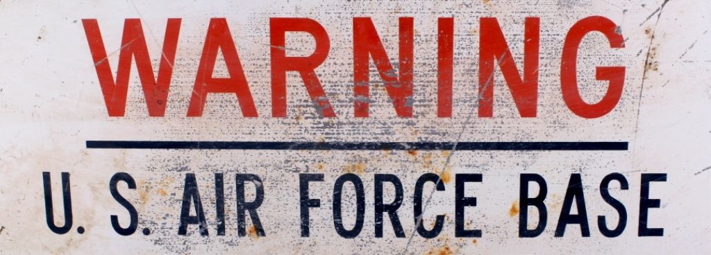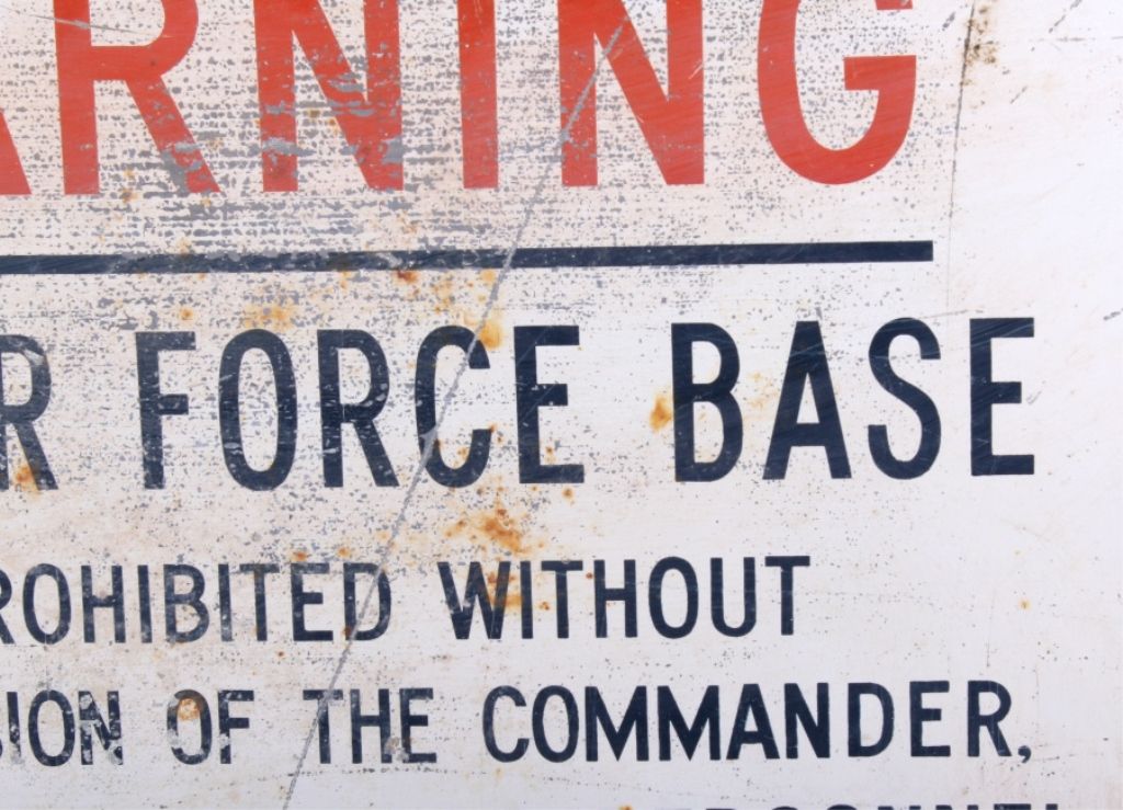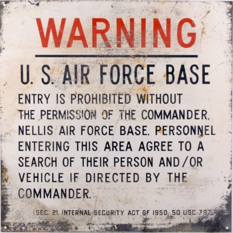 This lot features a warning sign from Nellis Air Force Base in Nevada. This sign was used at an entrance to the base. The sign is in good condition. It measures 24" x 24".