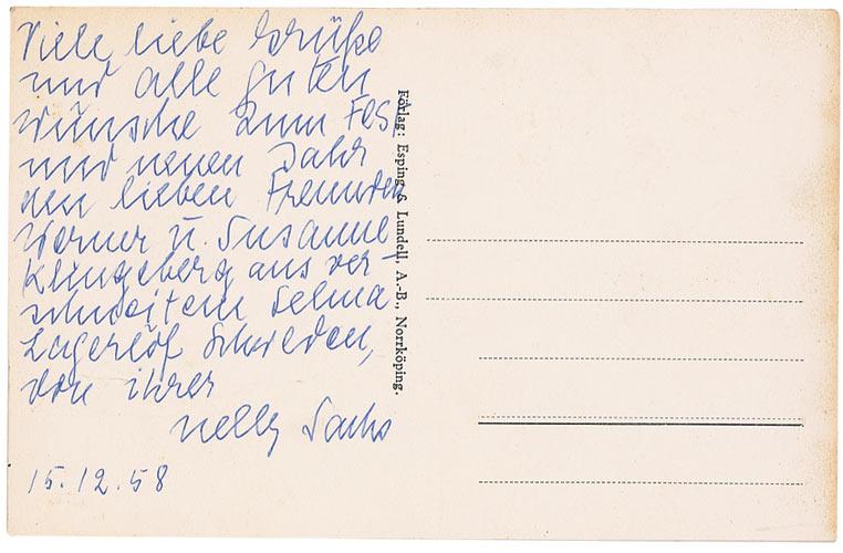 Poet and playwright (1891–1970) who fled from Nazi Germany in 1940 and won the Nobel Prize for Literature in 1966. ALS in German, on the correspondence side of a 5.5 x 3.5 postcard, December 15, 1958. Postcard to her "dear friend Susanne Klingeberg,” in rememberance of "the Sweden of Selma Lagerlof,” and mentioning another Swedish Nobel Prize recipient In fine condition, with some mild edge toning.