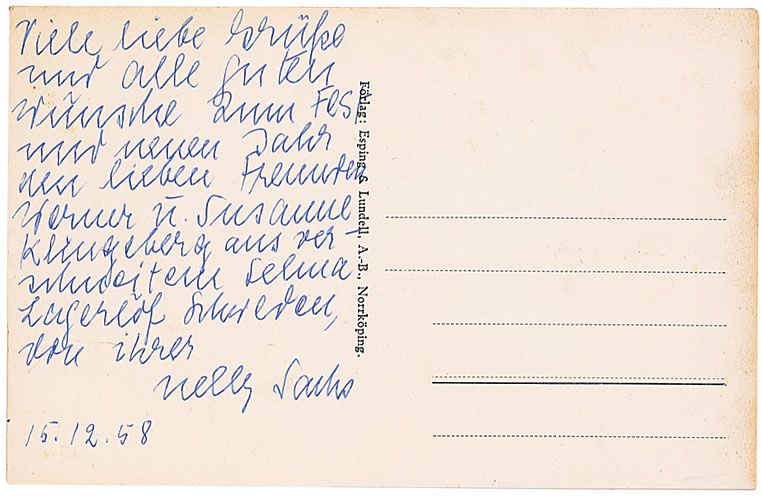 Poet and playwright (1891–1970) who fled from Nazi Germany in 1940 and won the Nobel Prize for Literature in 1966. ALS in German, on the correspondence side of a 5.5 x 3.5 postcard, December 15, 1958. Postcard to her "dear friend Susanne Klingeberg,” in rememberance of "the Sweden of Selma Lagerlof,” and mentioning another Swedish Nobel Prize recipient. In fine condition, with some mild edge toning.