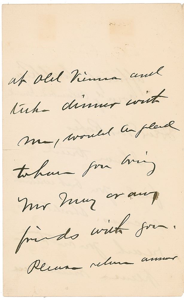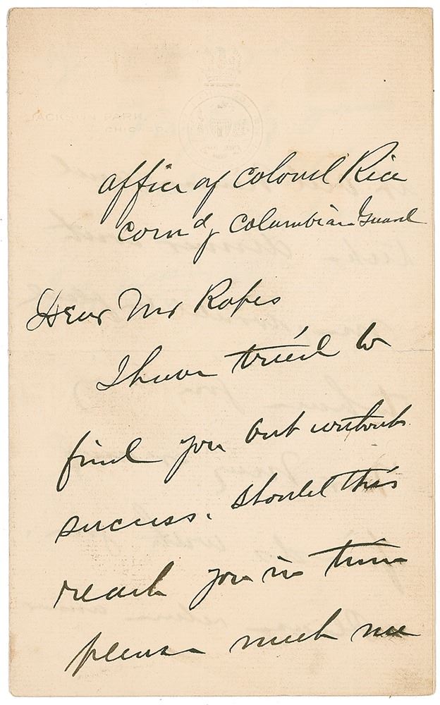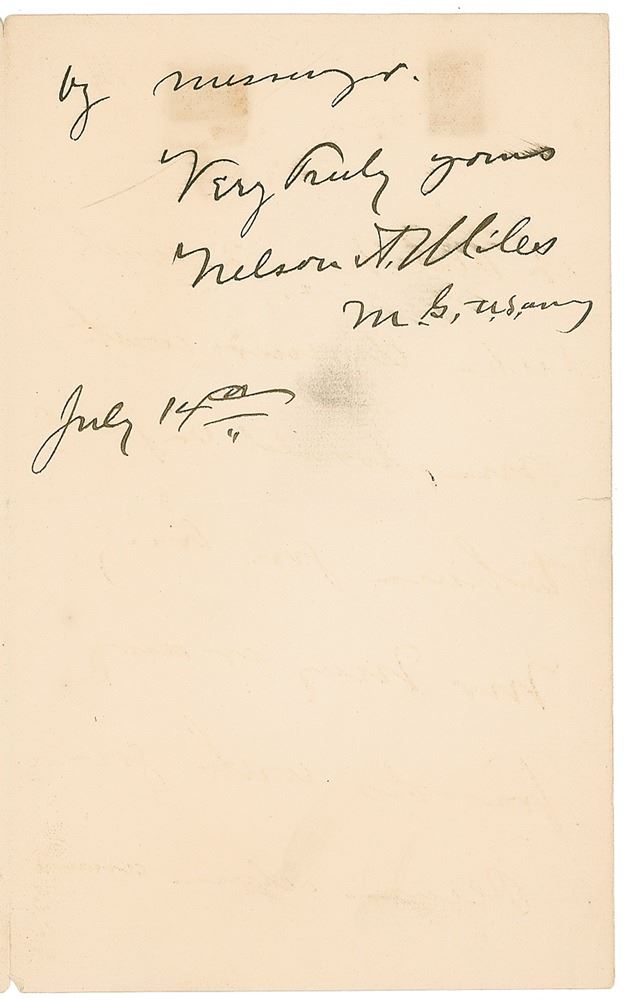 ALS, signed "Nelson A. Miles, M. G. U. S. Army," three pages on two adjoining sheets, 5 x 8, embossed Chicago World's Fair letterhead, July 14, circa 1892. Handwritten letter from the "Office of Colonel Rice, Commd'g Columbian Guard." In part: "I have tried to find you but without success. Should this reach you this time please meet me at Old Vienna and take dinner with me, would be pleased to have you bring…any friends with you." In very good to fine condition, with several stains.