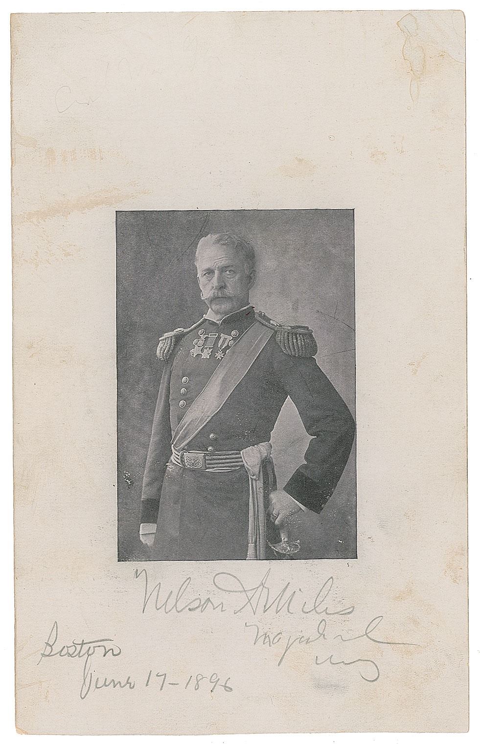Dinner menu for an event honoring Nelson A. Miles, 5.5 x 8.75, signed on the front below his portrait in pencil, "Nelson A. Miles, Major Gen'l, Com'g, Boston, June 17–1896." In very good to fine condition, with light staining and soiling to the front.