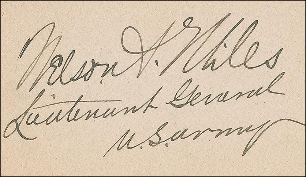 Ink signature, “Nelson A. Miles, Lieutenant General, U.S. Army,” on an off-white 3.5 x 2 card. In fine condition, with a uniform shade of mild toning.