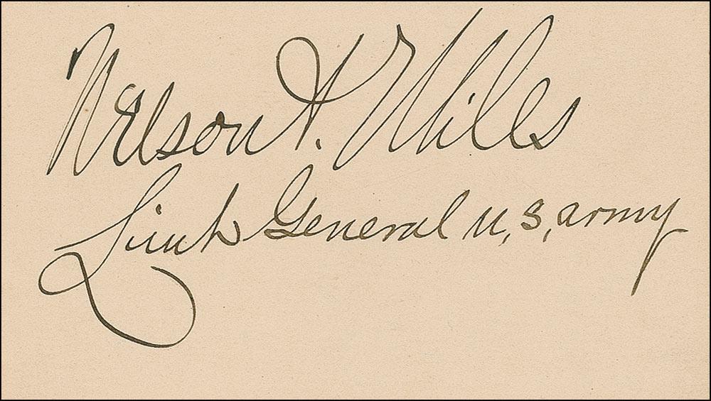 American soldier (1839–1925) who earned a niche in military history as the only man to serve as an officer in the Civil War, Indian Wars, and Spanish-American War. Though the nearly eighty-year-old Miles volunteered to serve during World War I, his offer was declined by Woodrow Wilson. Ink signature, “Nelson A. Miles, Lieut. General, U.S. Army,” on an off-white 3.5 x 2 card. In fine condition. Accompanied by the original mailing envelope, postmarked December 6, 1915.