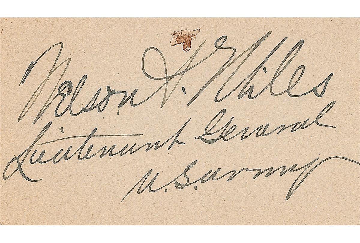American soldier (1839–1925) who is the only man to serve as an officer in the Civil War, Indian Wars, and Spanish-American War. Ink signature, “Nelson A. Miles, Lieutenant General, U. S. Army,” on an off-white 3.5 x 2 card. In fine condition, with a stain to the top edge.