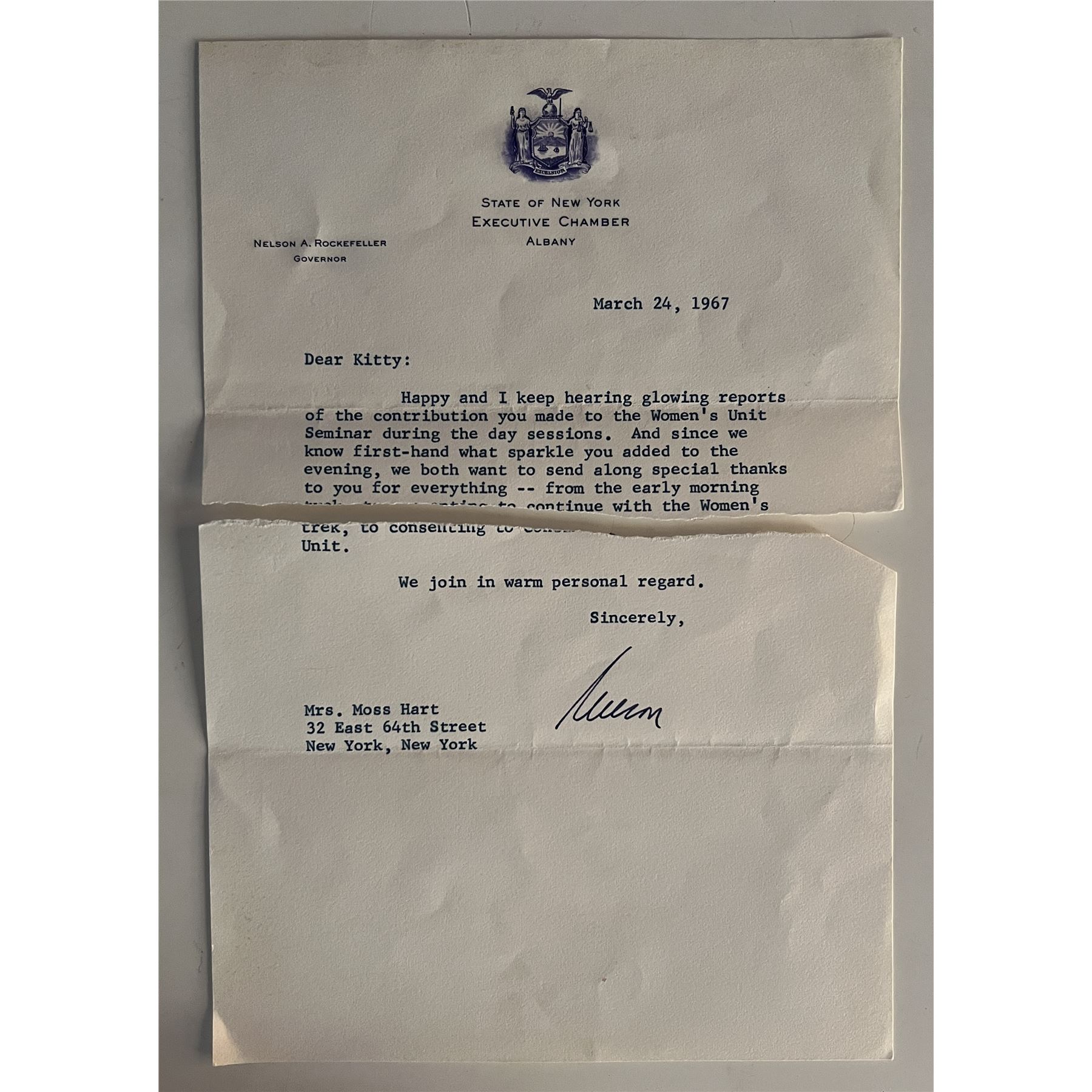 Nelson A. Rockefeller signed letter. Document is torn in half. 7x9 inches