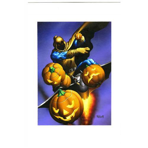 <B>Nelson DeCastro - Marvel Masterpiece Trading Card Illustration, "Hobgoblin" Original Art (Fleer, 1995).</B></I> That maniacal pumpkin bomb-thrower, Hobgoblin, never looked so good -- or should we say, bad -- than in this sinister illustration by Nelson DeCastro. Perched on his flyer, Spidey's deadly foe sends a few deadly orange bombs your way, in this wicked image created for the 1995 <B>Marvel Masterpieces</B></I> trading card set. Painted in acrylics on heavy illustration, the art has an image area of 8" x 11", and is in Excellent condition.