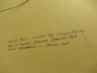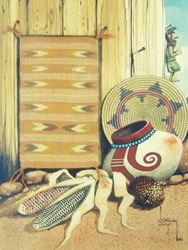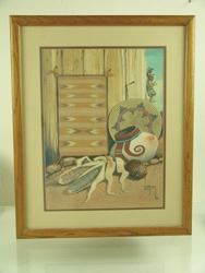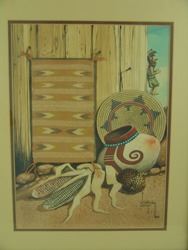 Unique, signed original gouache on paper, a still life showing a Navajo basket, pottery, kachina, and an actual, fine weave, miniature Crystal rug by Evelyn Begay, inserted into the painting. Very good condition. Ca. 1981. 16" x 12" (21" x 17")