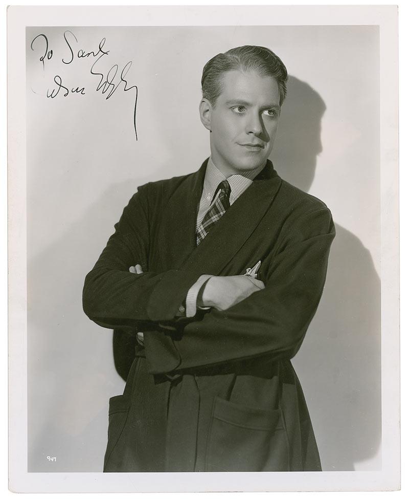 Vintage pearl-finish 8 x 10 MGM publicity photo of Eddy with his arms folded, credited to Virgil Apger, signed and inscribed in-person in fountain pen “To Saul, Nelson Eddy.” Reverse of photo bears collector’s stamp date of February 10, 1936, the date the signature was acquired. Some scattered light surface marks and a diagonal impression to image from affixed caption on reverse, otherwise fine condition. Saul Goodman Collection.