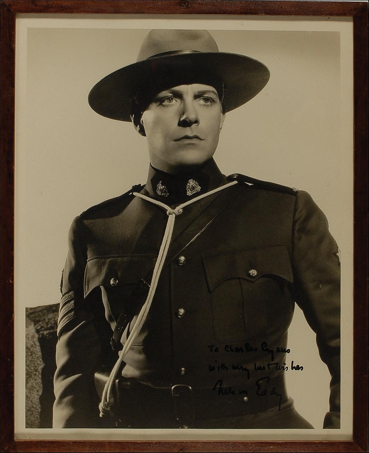 Vintage matte-finish 10.75 x 13.5 publicity photo depicting Eddy in his most iconic role as Sergeant Bruce of the Royal Canadian Mounted Police from the 1936 movie Rose-Marie, signed and inscribed in fountain pen “To Charles Cyrus with very best wishes, Nelson Eddy.” Framed to an overall size of 11.75 x 14.75. In fine condition, with silvering to some of the darker portions.
