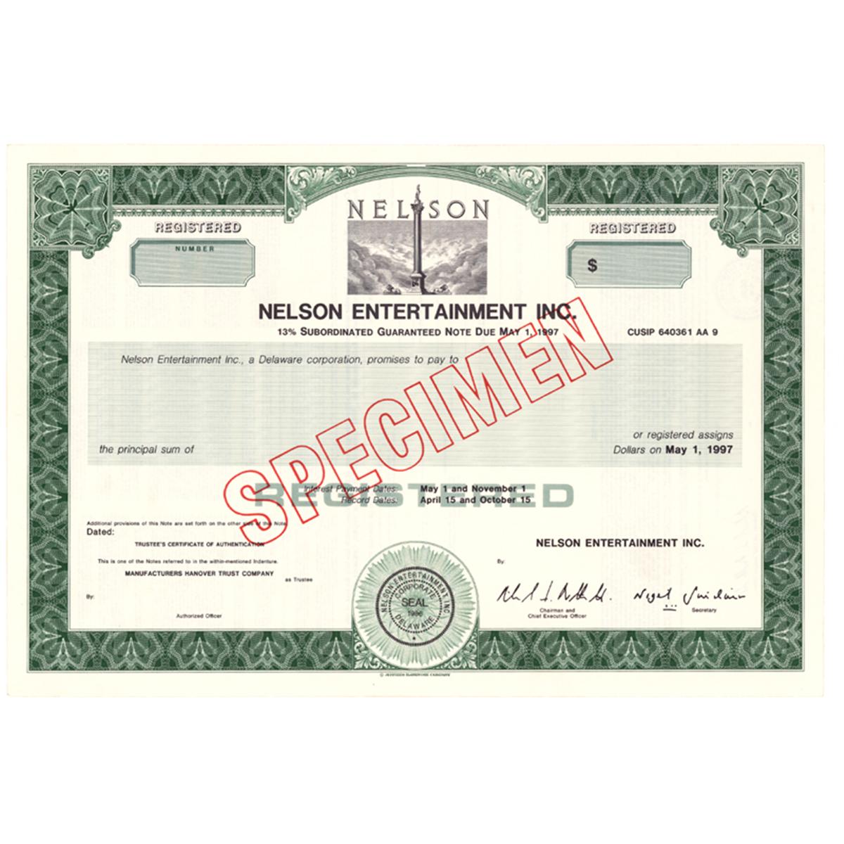 [Specimen]. ----, Delaware. 13 % subordinated guarantee note in Nelson Entertainment, Inc. Green / Black. Vignette of a the Nelson Entertainment logo at top center. Specimen print across center of bond. Very Fine.