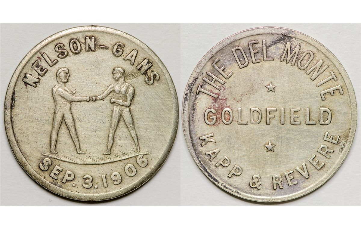 This token is a rare piece of boxing history! The famous fight took place on Labor Day 1906 and drew a huge crowd to the mining town. Gans won the fight after a grueling 42 rounds. Obverse: THE DEL MONTE/ GOLDFIELD/ KAPP & REVERE. Reverse: NELSON-GANS/SEP. 3, 1906. It measures 21mm and is VF- XF - HKA#65240