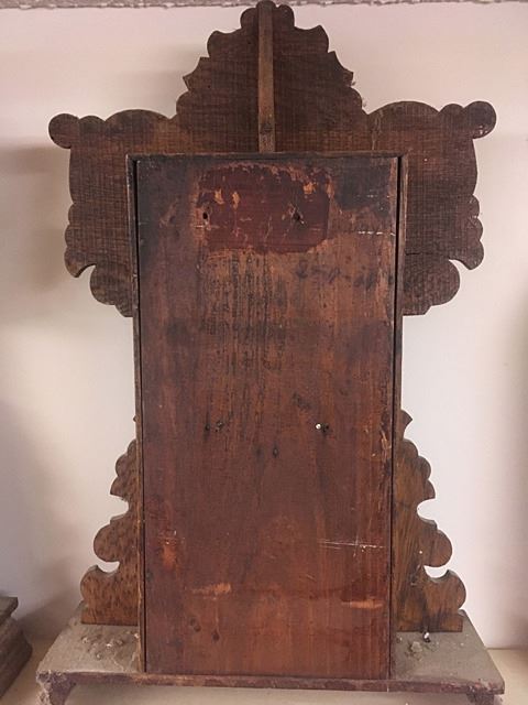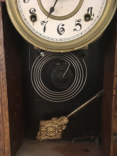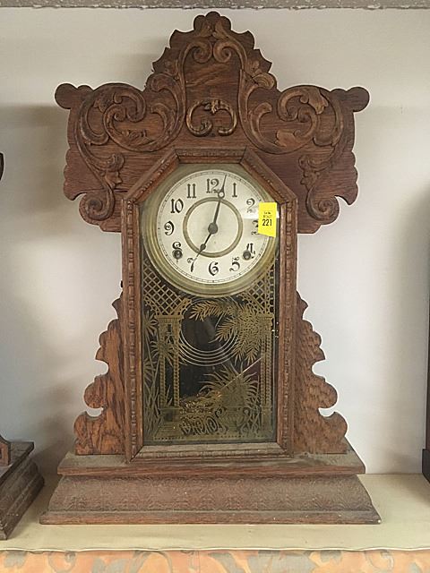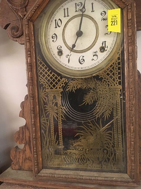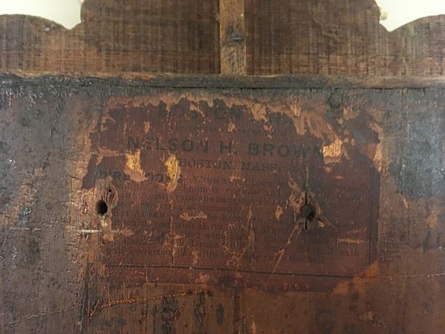 Nelson H. Brown, Boston Mass, Gingerbread shelf clock, ornate face, gold on glass with ferns and columns, pendulum.