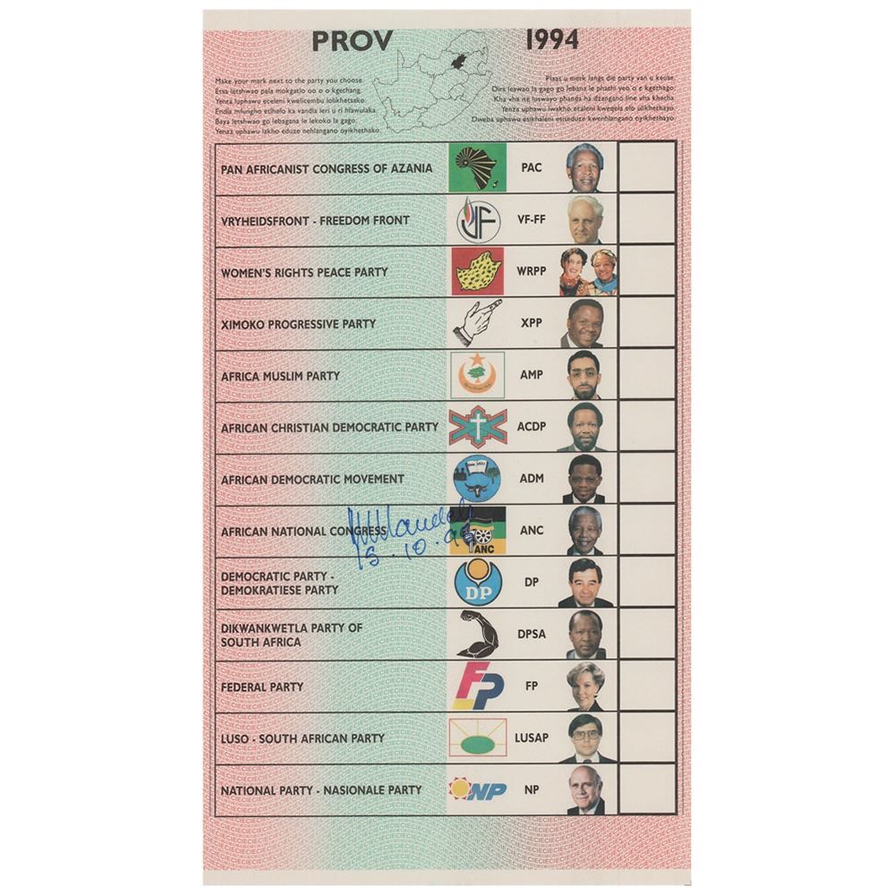 Uncommon color 6.75 x 12 ballot for the 1994 Republic of South Africa general elections, signed near his image in blue felt tip, "N. Mandela, 15.10.99." In very fine condition. Mandela became the country's first black chief executive when his African National Congress won a sweeping victory in the South African general election of 1994.