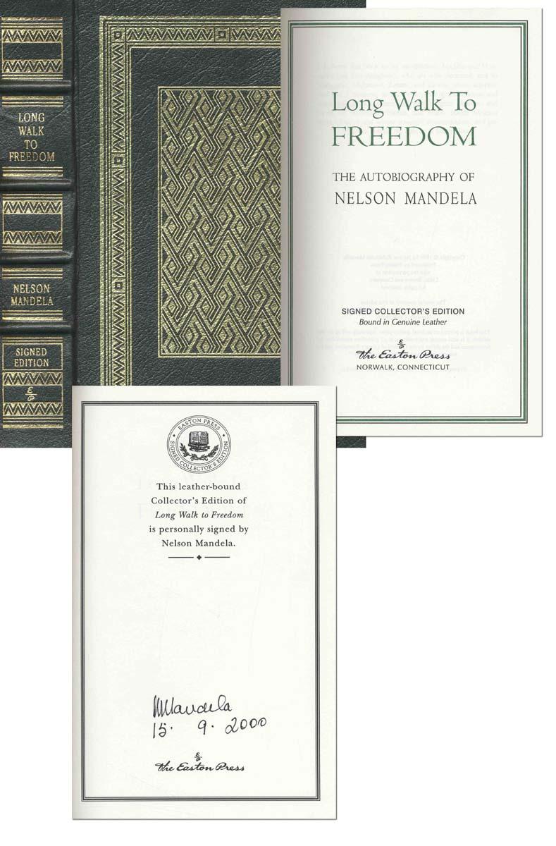 Nobel Peace Prize winner and first democratically-elected President of South Africa, Nelson Mandela's signed autobiography, ''Long Walk to Freedom.'' Norwalk, CT: Easton Press: 2000. Rare book signed and dated, 15 September 2000, on title page in dark ink by Mandela, who began this autobiography during his 27 years in prison. Luxuriously bound in emerald green leather with 22 karat gilt lettering, page ends and designs on covers. Interior printed on acid-neutral paper resistant to toning. Pages smyth-sewn, moire fabric endsheets and ribbed spine. Also includes sewn in silk book marker. From a print run of 1,000, this volume is in unread condition. An elegant, pristine edition, 558 pages, measuring 6.25'' x 9.5''. Beautiful condition.