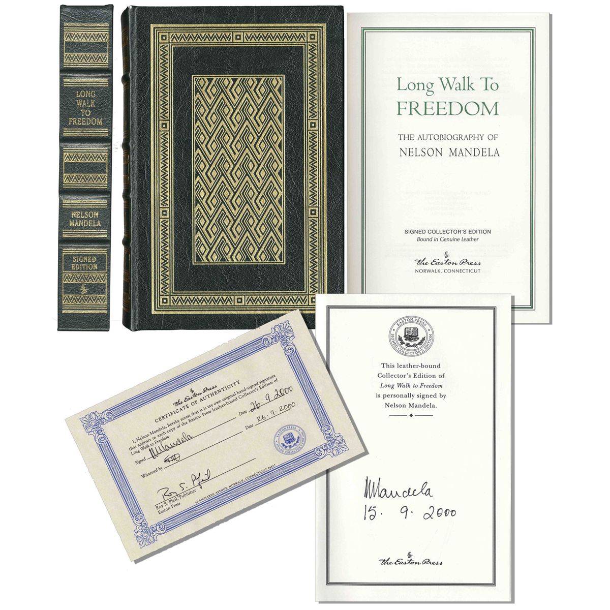Nobel Peace Prize winner and first democratically-elected President of South Africa, Nelson Mandela's signed autobiography, ''Long Walk to Freedom.'' Easton Press: Norwalk, CT: 2000. Luxuriously bound in emerald green leather with 22 karat gilt lettering, page ends and designs on covers. Also includes sewn-in silk book marker. From a print run of 1,000, this volume is in unread condition and accompanied by the COA issued by Easton Press. An elegant, pristine edition, 558 pages, measuring 6.25'' x 9.5''. Fine condition.