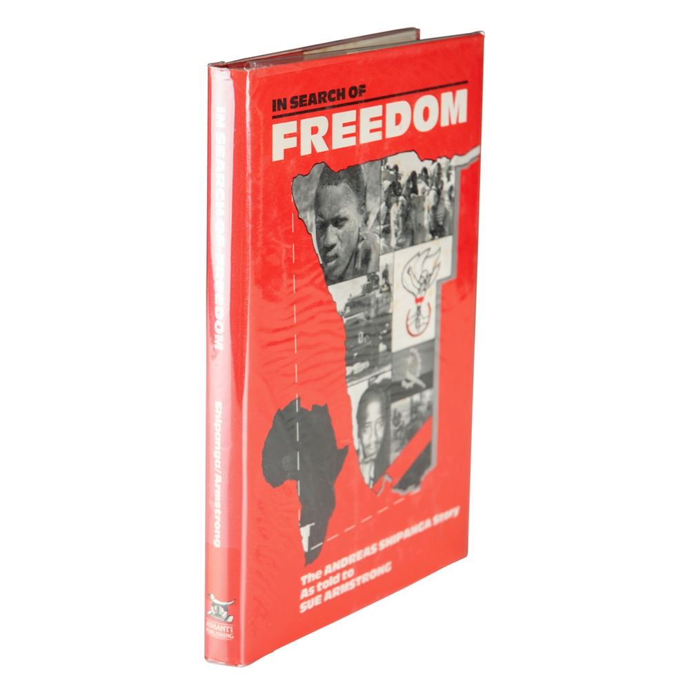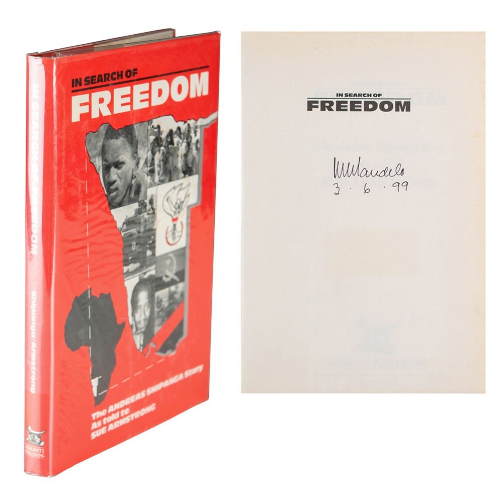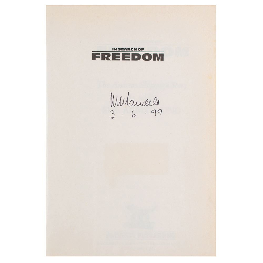 Signed book: In Search of Freedom. First edition. Cape Town, South Africa: Ashanti Publishing, 1989. Hardcover with dust jacket, 6 x 8.5, 164 pages. Signed on the half-title page in black ballpoint, "N. Mandela, 3-6-99." In fine condition, with a very faint area of toning.
