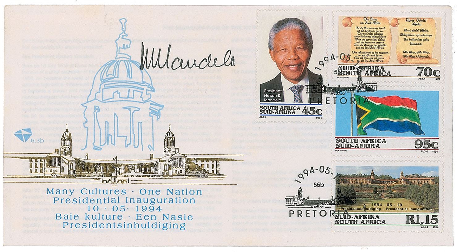 Commemorative cover with a cachet honoring the inauguration of Nelson Mandela as president of South Africa in 1994, signed in black felt tip, "N. Mandela." In very fine condition.
