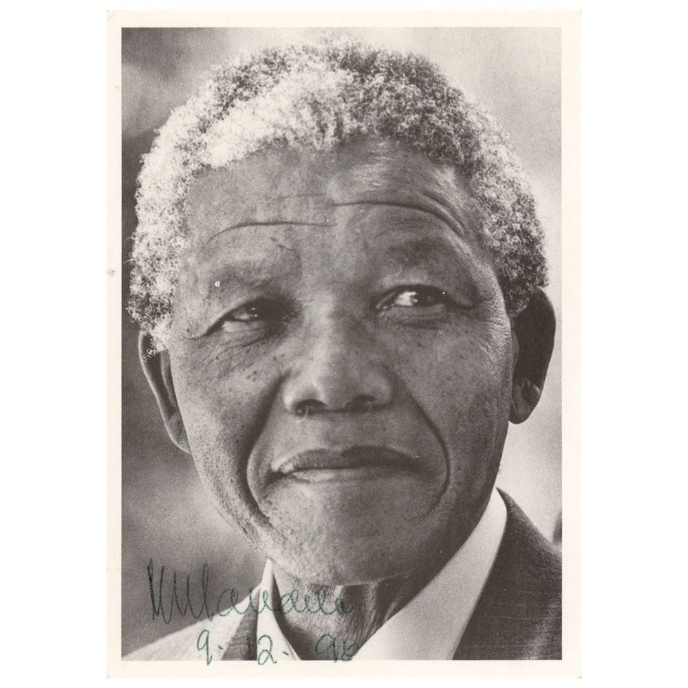 Appealing glossy 4 x 5.75 silver gelatin photo of Nelson Mandela, signed in black ink, "N. Mandela, 9-12-96." In fine condition, with a few small creases, and a paperclip impression to the top edge.