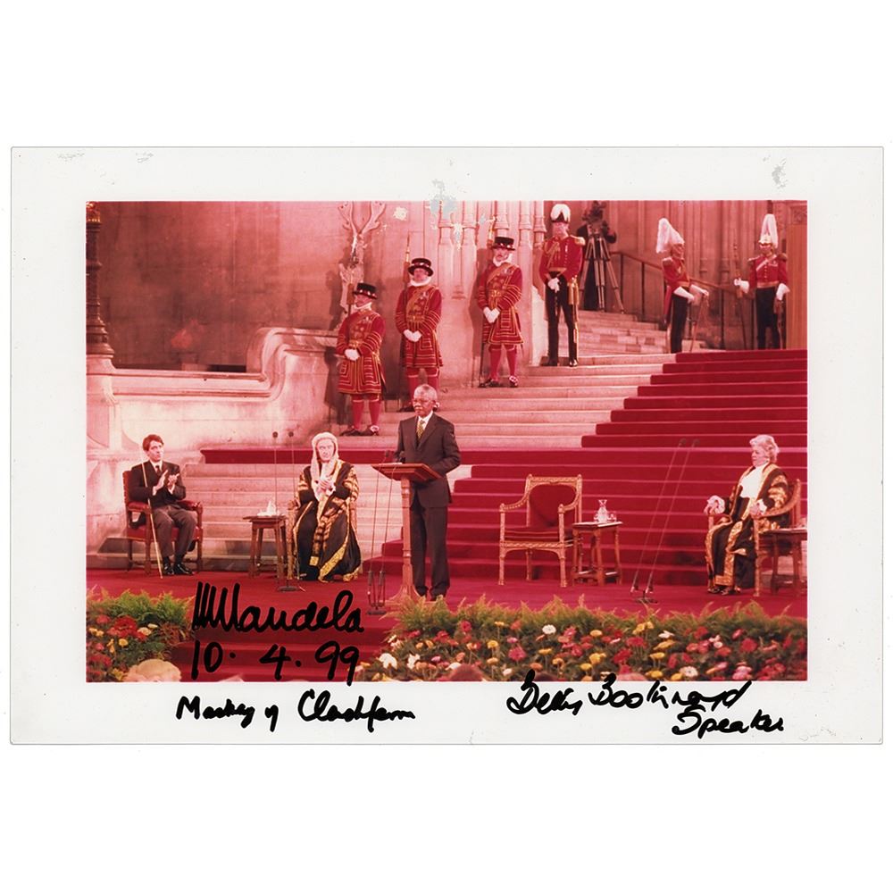 Scarce color glossy 12 x 8.25 photo of South African President Nelson Mandela, watched by Lord James Mackay and Baroness Betty Boothroyd, delivering a speech at the Palace of Westminster during his State Visit to Britain on July 11, 1996, in London, England, signed by all three in black felt tip, "N. Mandela, 10-4-99," "Mackay of Clashfern," and "Betty Boothroyd, Speaker." Reverse bears a "Daily Telegraph" copyright label. In fine condition, with scattered scuffs and stains, primarily to the borders and top edge of the image.