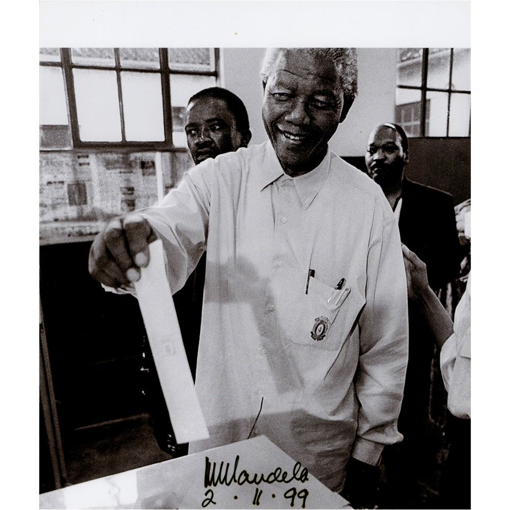 Historic glossy 8 x 9.5 photo of Nelson Mandela casting his vote in the 1994 elections, signed in black felt tip, "N. Mandela, 2.11.99." In fine condition, with a small surface crease to the lower left background area. This important image shows the first time that Mandela voted in his life.