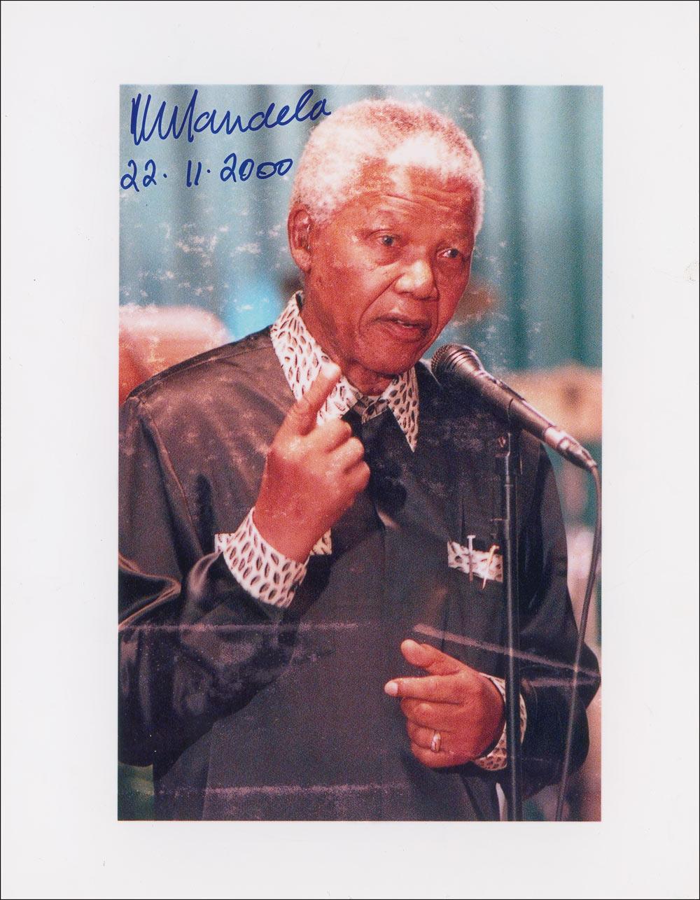 Color glossy 8 x 10 photo of Mandela speaking, signed in-person in blue felt tip, “N Mandela, 22.11.2000.” In fine condition, with light surface marks inherent to the original negative. Originally obtained by in-person specialist Mike Wehrmann.