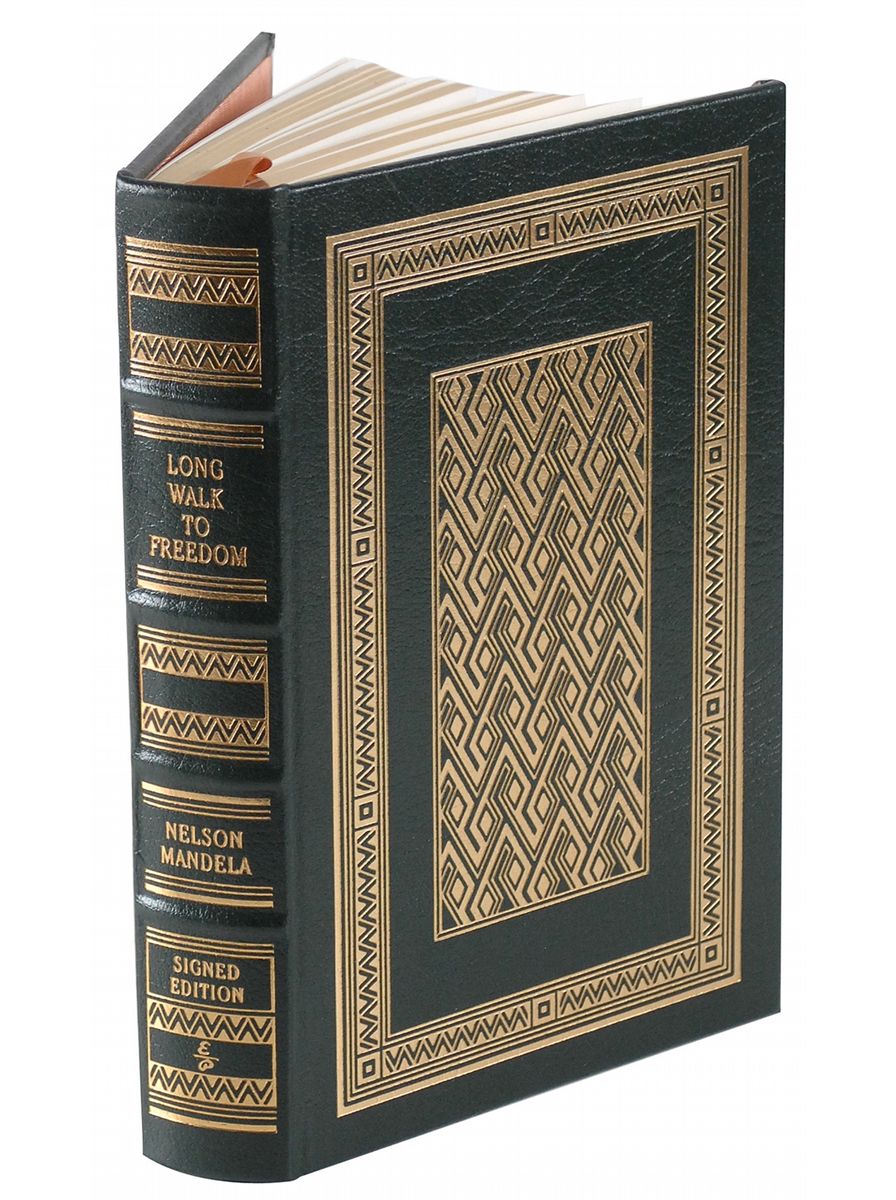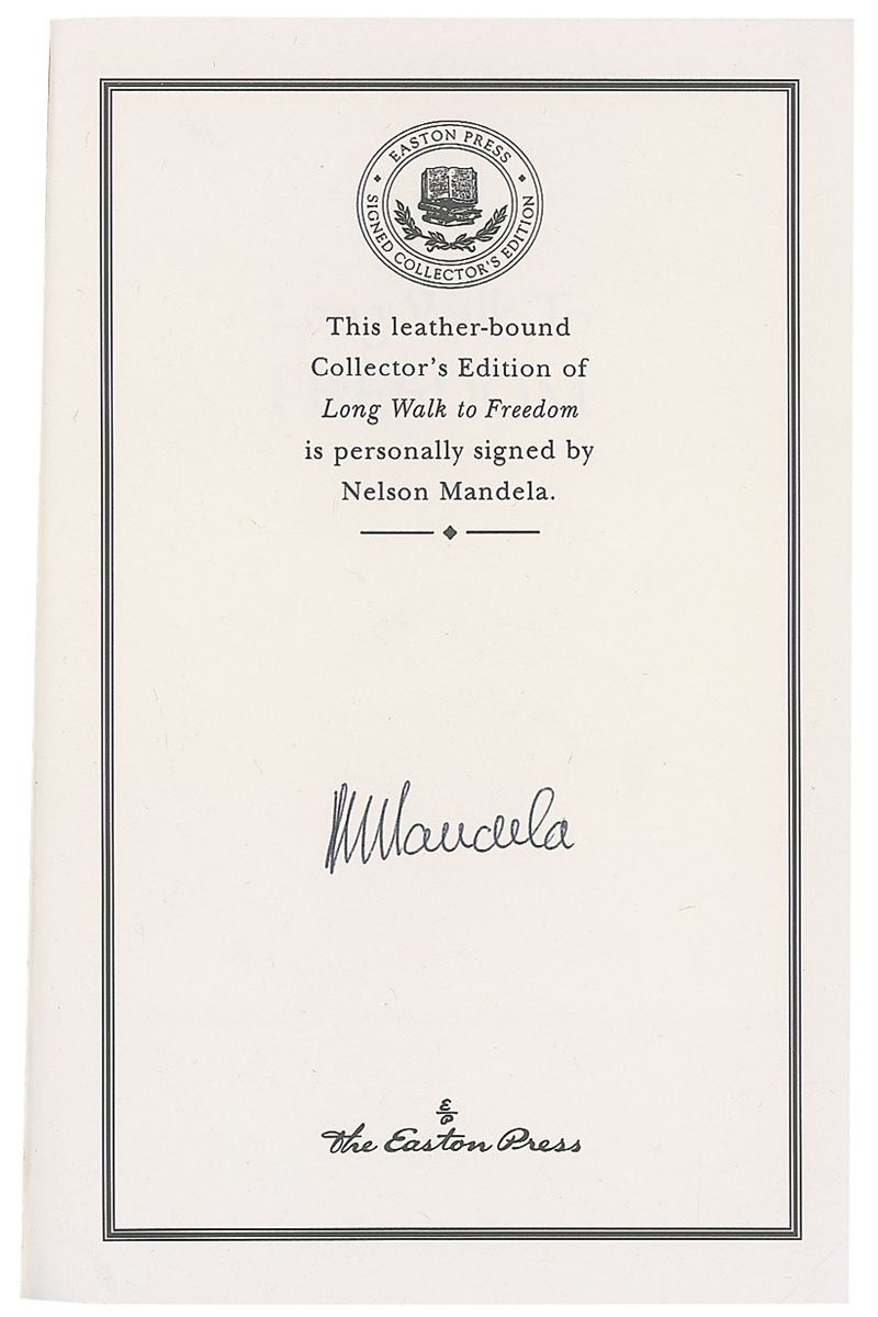 Signed book: Long Walk to Freedom. Collector’s edition. Norwalk, CT: Easton Press, 2000. Leatherbound hardcover, 6.5 x 9.5, 558 pages. Signed on the colophon in black ballpoint, “N. Mandela.” In very fine condition.