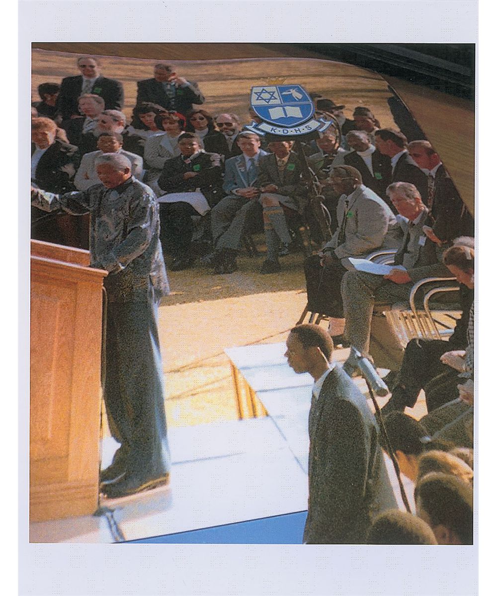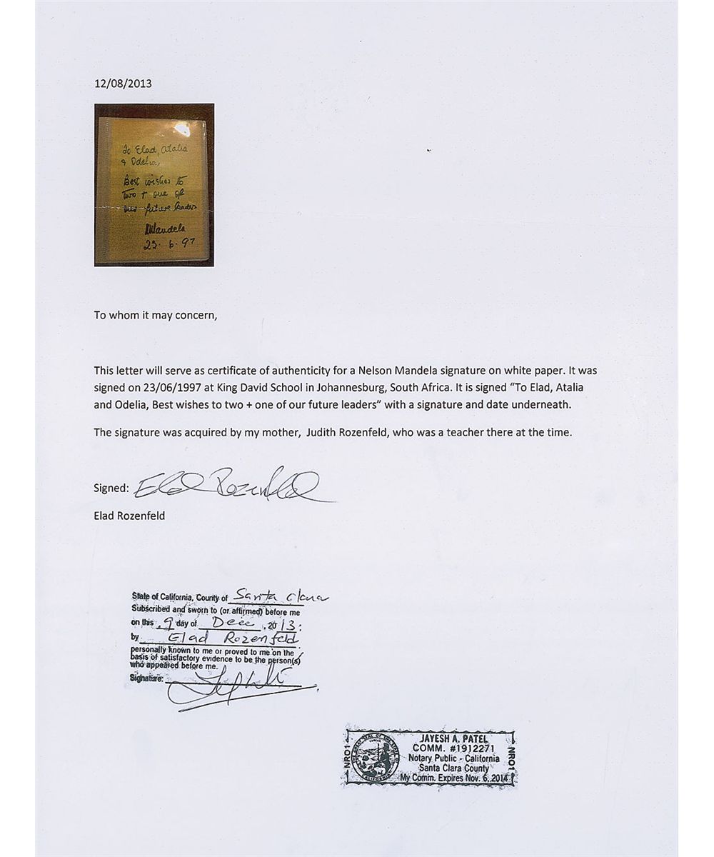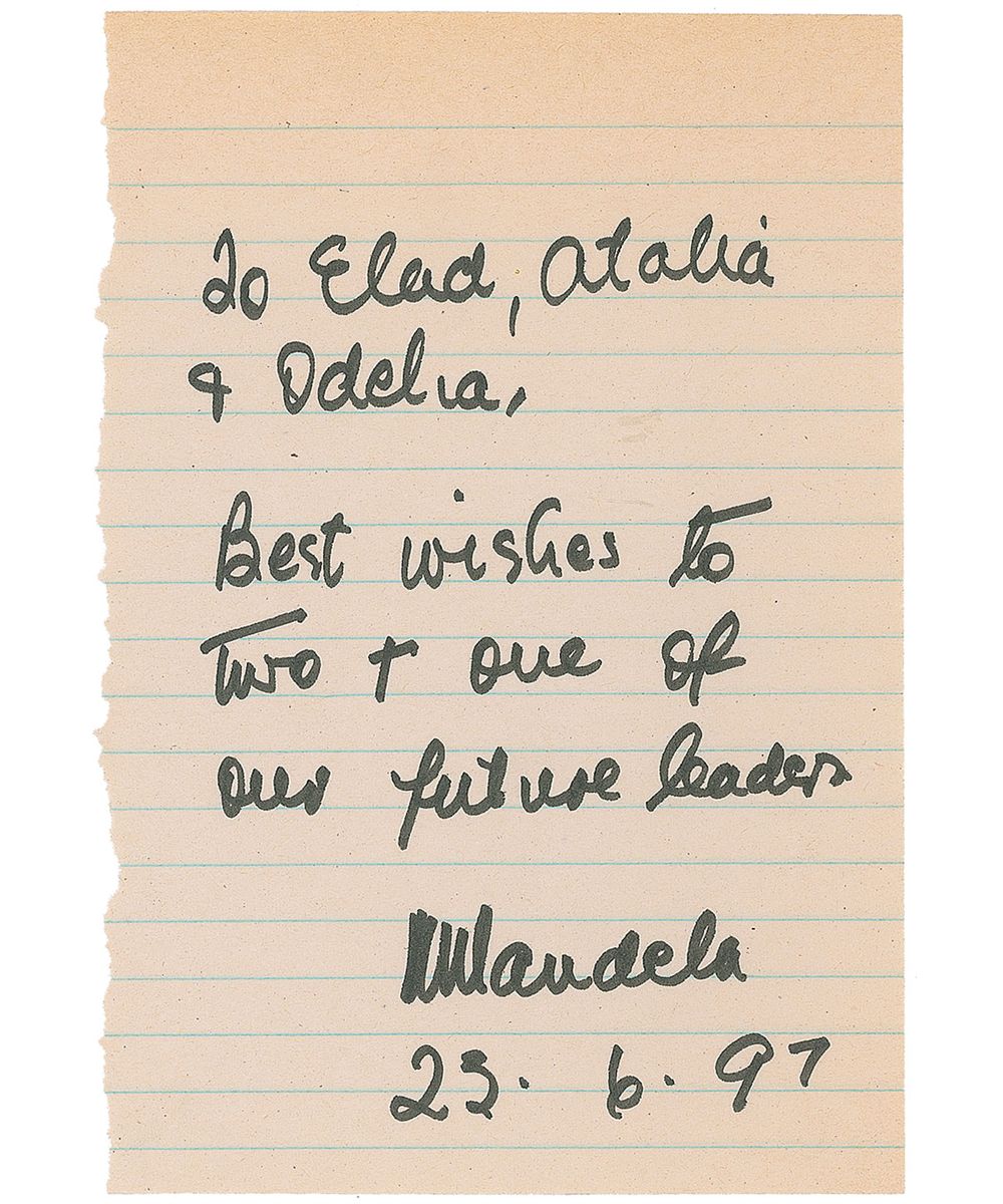 ANS signed “N. Mandela,” one page, lightly-lined, 4 x 5.75, June 23, 1997. Brief note written for a teacher at the King David School in Johannesburg, South Africa. In full: “To Elad, Atalia & Odelia, Best wishes to two + one of our future leaders.” In fine condition, with subtle uniform toning. Accompanied by an image of Mandela speaking at the school on the day this was written, as well as a notarized letter of provenance from “Elad,” whose mother acquired the autograph.