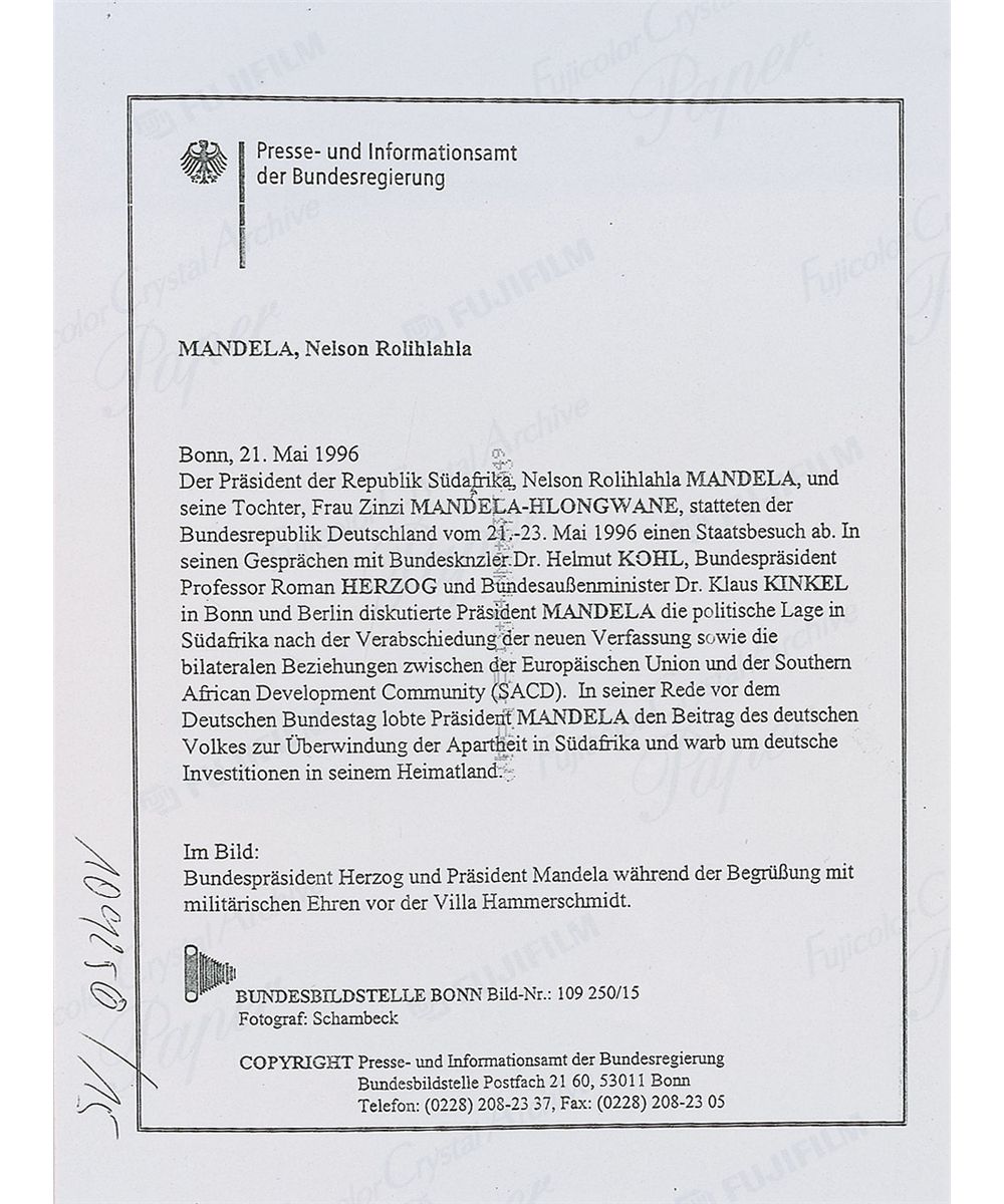 Color glossy 9.25 x 7 photo of Mandela with President Roman Herzog of Germany in 1996, signed in gold ink, “N. Mandela, 13.7.2001.” In fine condition, with slight irregular ink adhesion to signature. Mandela went to Germany to discuss the political situation in South Africa, seeking to strengthen bilateral relations and encourage European investment in his country. An uncommon photo of the South African leader actually engaged in the realm of international politics.