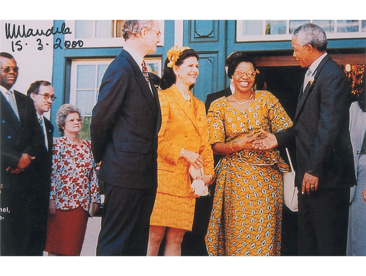 Color glossy 11.75 x 7.5 photo of Mandela shaking hands at an official event, signed in black felt tip, “N. Mandela, 15-3-2000.” In fine condition, with some rubbing and adhesive remnants to surface.