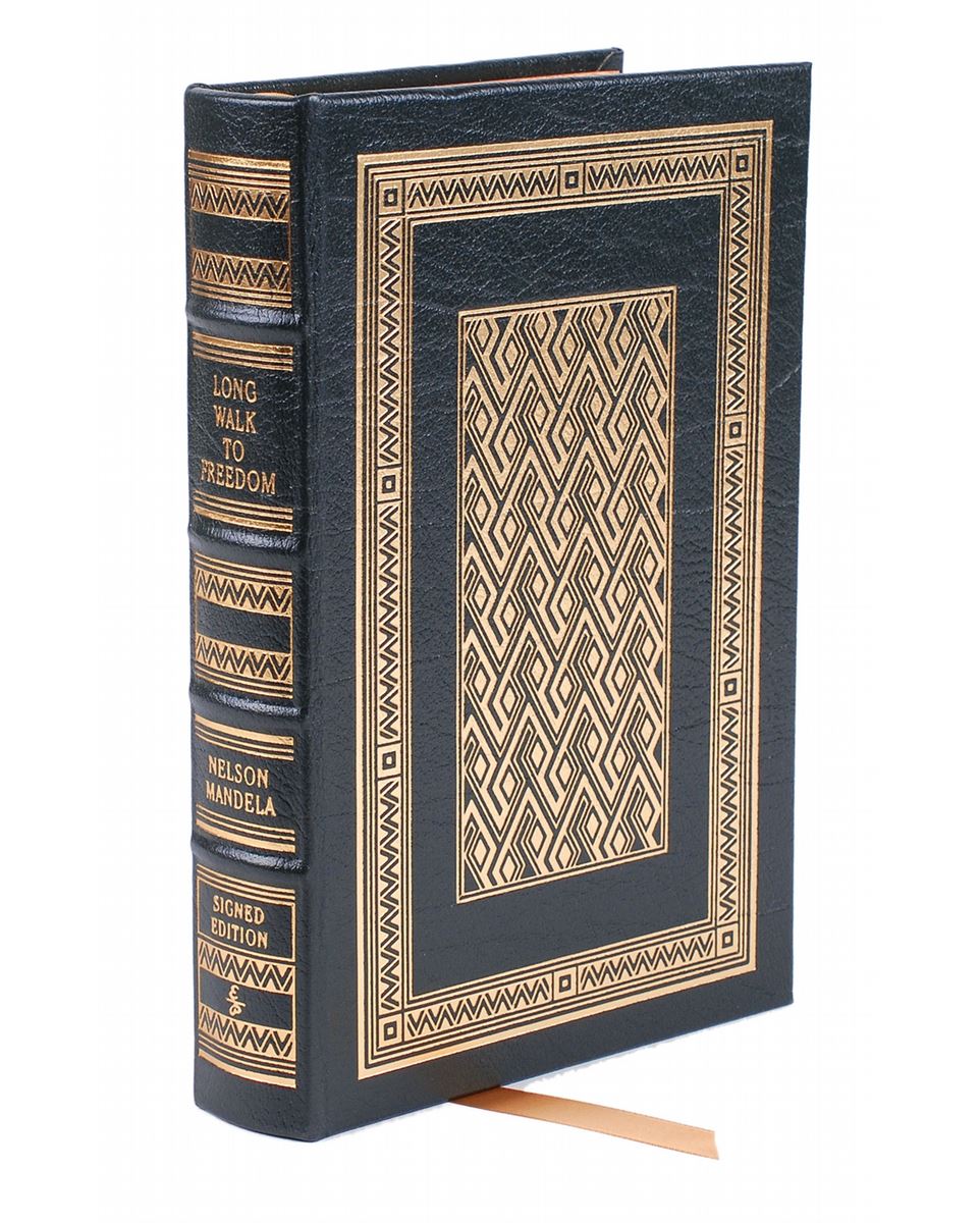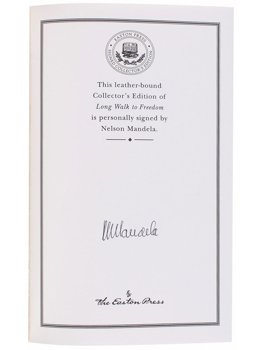 Signed book: Long Walk to Freedom. Collector’s Edition. Norwalk, CT: Easton Press, 2000. Leather-bound hardcover, 6.25 x 9.5, 558 pages. Signed on the designated page in black ballpoint, “N. Mandela.” In very fine condition. Accompanied by the publisher’s original certificate of authenticity indicating that the book was signed on September 26, 2000.