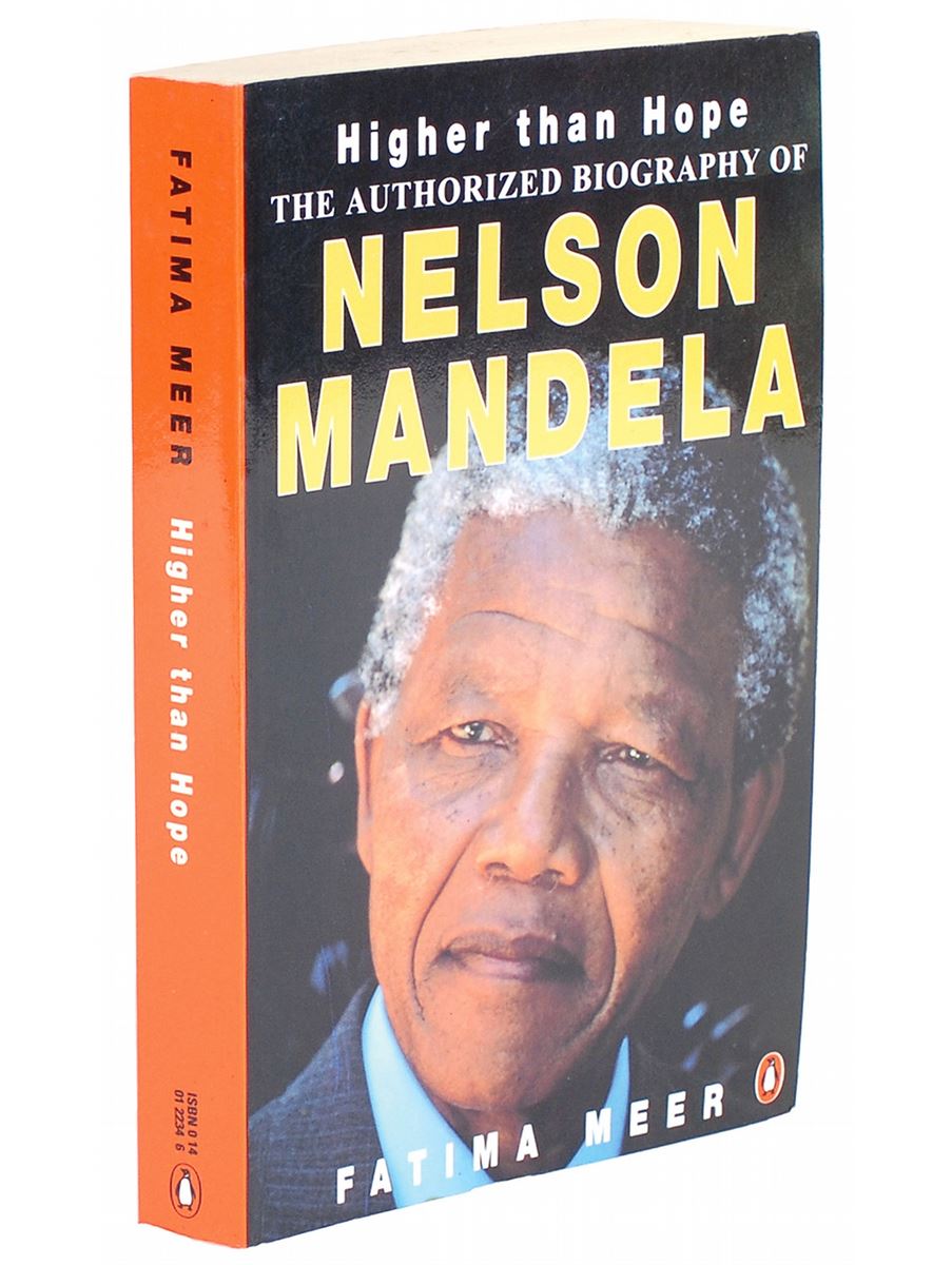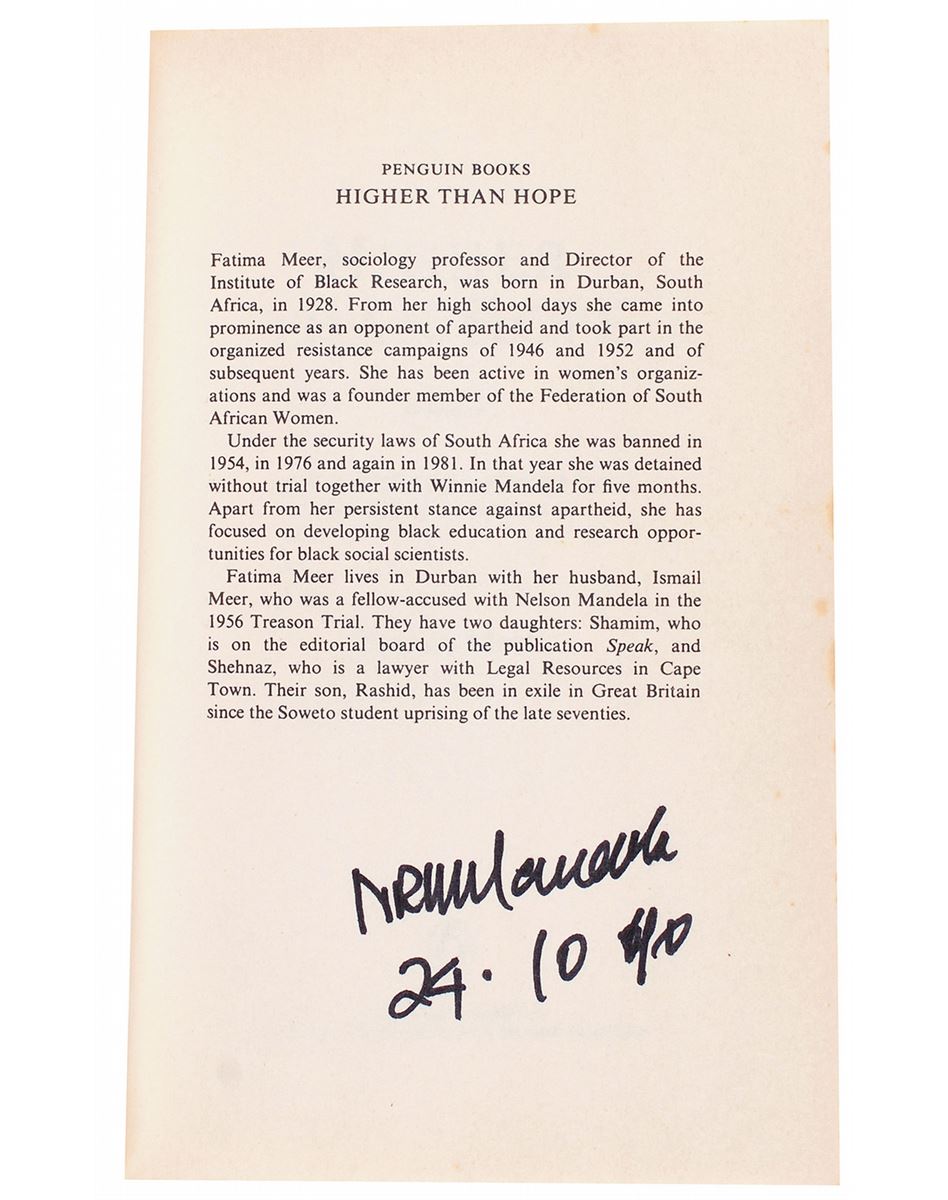 Signed book: Higher than Hope. Later printing. London: Penguin Books, 1990. Softcover, 5 x 7.75, 456 pages. Signed on the author’s biographical page in black felt tip, “N. R. Mandela, 24-10-90.” Staining to text block edges, otherwise fine condition. Originally obtained by in-person collector Richard Simpkin, and mentioned in his book, Richard & Famous, on page 26. This book was signed in the lobby of the Hilton in Sydney, Australia, on October 24, 1990, during Mandela’s first trip outside South Africa after being released from prison.