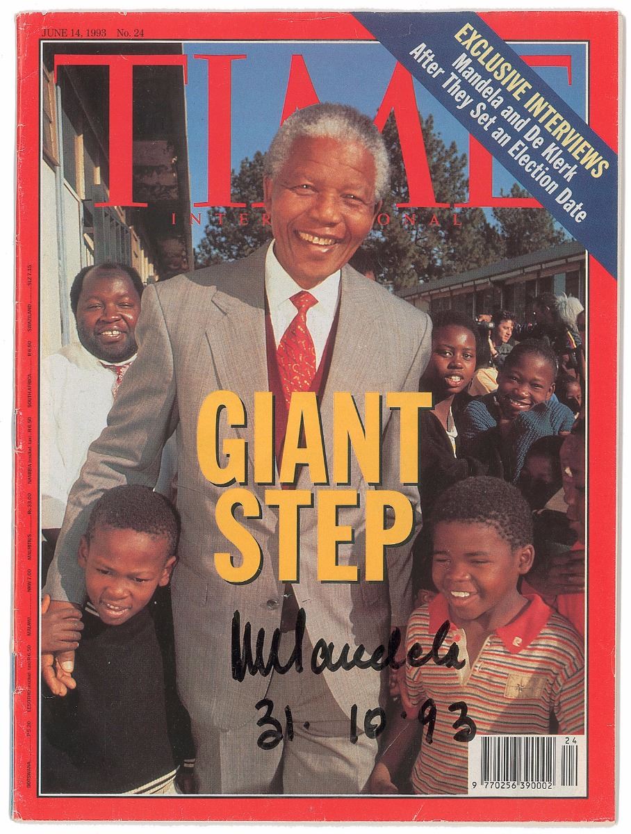 Time magazine from June 14, 1993, 64 pages, 8 x 10.75, signed on the front cover in black felt tip, “N. Mandela 31.10.93.” In fine condition, with some scattered light creases and handling wear. Accompanied by a full letter of authenticity from PSA/DNA.