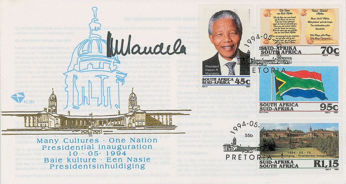 Commemorative cover, 7.5 x 4, with a cachet honoring the presidential inauguration of Mandela on May 10, 1994, signed in black felt tip, “N. Mandela.” In fine condition.