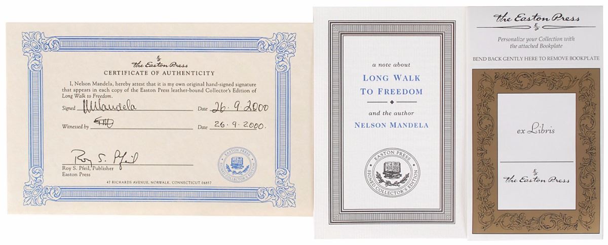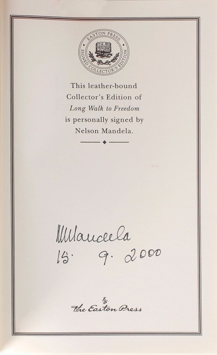 Signed book: Long Walk to Freedom. Collector’s Edition. Norwalk, CT: Easton Press, 2000. Leatherbound hardcover, 6.25 x 9.5, 558 pages. Signed on the colophon in black felt tip, “N. Mandela, 15-9-2000.” In very fine condition. Accompanied by the publisher’s original certificate of authenticity. A gorgeous edition of Mandela’s autobiography.