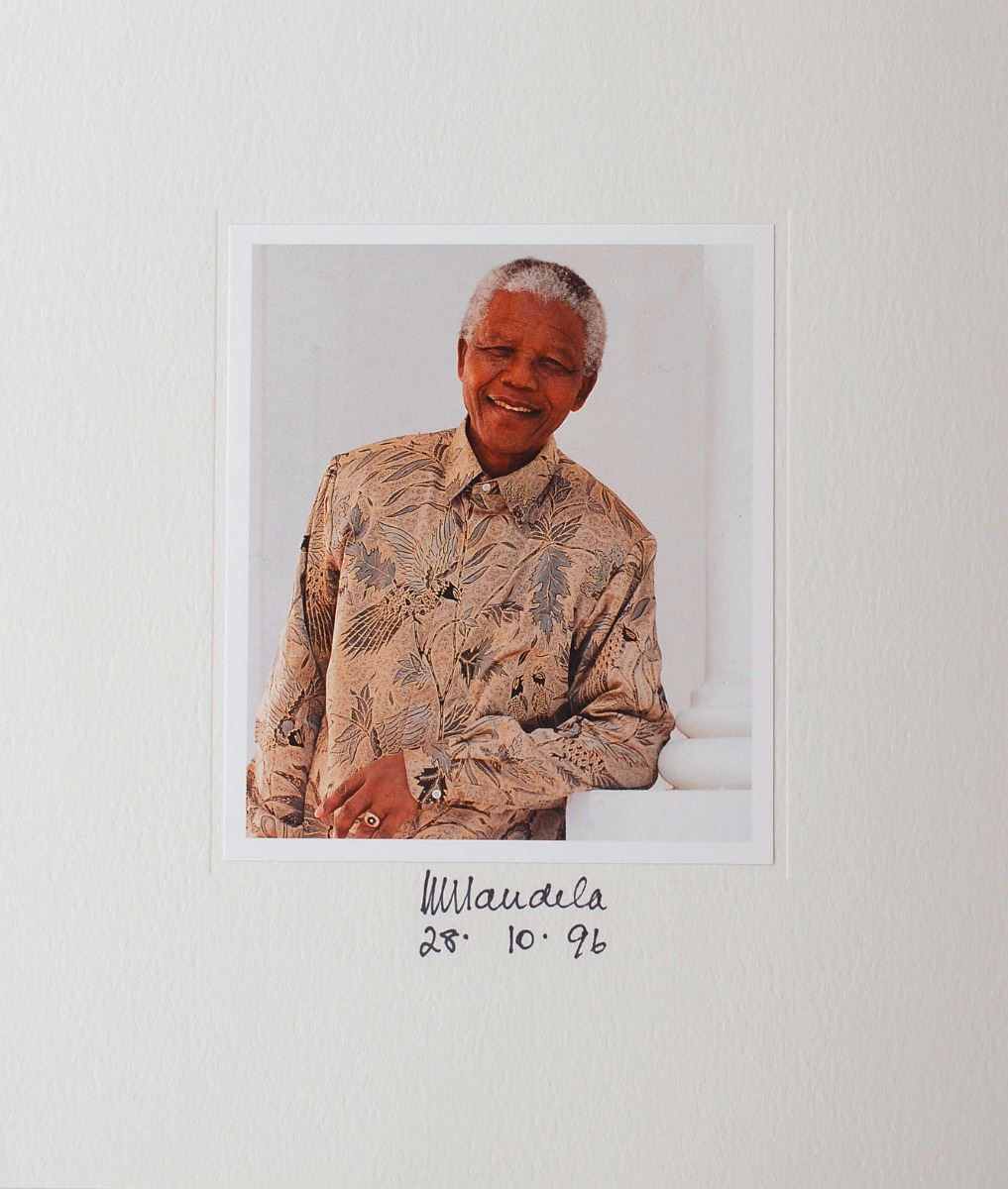 Signed book: The Illustrated Long Walk to Freedom. Limited first edition, numbered 236/425. Boston: Little, Brown and Company, 1996. Hardcover with slipcase, 10 x 11.75, 208 pages. Includes a specially commissioned portrait of Mandela by photographer Benny Gool, affixed to its original 9 x 10.5 presentation mat, neatly signed as president on the mat in black felt tip, “N. Mandela, 28.10.96.” Autographic condition: fine. Book condition: Fine/None, in a NF clamshell case. Expertly bound in South African Wassa goatskin, this extensively illustrated edition remains an uncommon and highly coveted autobiography of the revered South African revolutionary.