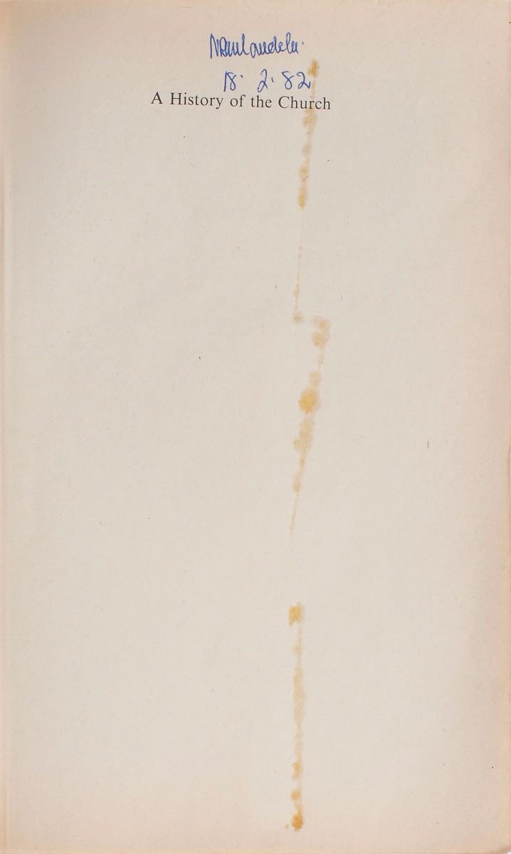 Signed book: A History of the Church: Volume 3. Later printing. London: Sheed and Ward, 1979. Paperback, 5.25 x 8.5, 558 pages. Signed at the top of the half-title page in blue ballpoint, “N. R. Mandela, 18.2.82.” In fine condition, with thin vertical stains, none touching the signature. Accompanied by a letter of provenance from the original recipient, Priscilla Jana, in full: “Please be advised that the book, ‘The History of the Church’ signed by Nelson Mandela in 1982 on Robben Island belonged to Nelson Mandela and was given to Priscilla Jana during one of her legal visits to him in prison. Priscilla Jane represented Nelson Mandela and the Mandela family as a lawyer while he was in prison from 1977 until his release.” Jana also represented notable figures like Thabo Mbecki, Archbishop Desmond Tutu, and Walter Sisulu, and later served as South Africa’s ambassador to Ireland and the Netherlands. Elevated by a signature more legible than typically seen, this is a superb piece from one of the most acclaimed figures in modern history.